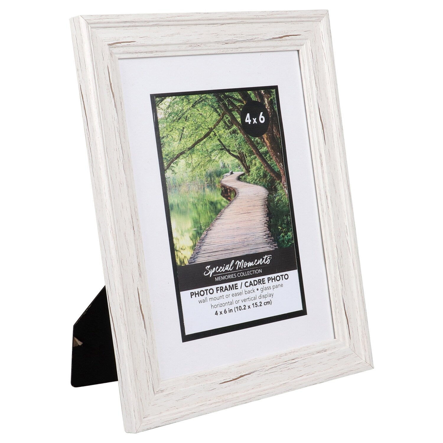 Comes with (Pack of 12). Special Moments White-Washed Frames with Borders provide a perfect home for your your captured memories or artwork. Display them in clusters or individually. They are always beautiful. These frames accommodate 4x6-in photos and come with hardware to hang horizontally or vertically. They also come with easels for setting them on mantels, shelves, tables, and more.