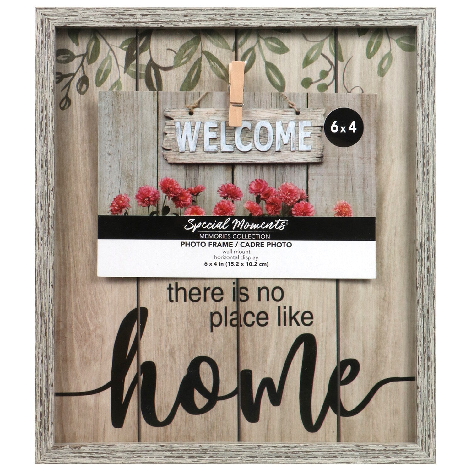 Comes with (Pack of 12). Special Moments Gray Farmhouse Clip Picture Frames are lovely decor pieces that accommodate 4x6-in photos, notes, artwork, and more. The total size of these pieces is 8x10 in. The top area reads "There is no place like home." The bottom portion has a clip waiting to hold your desired display pieces.