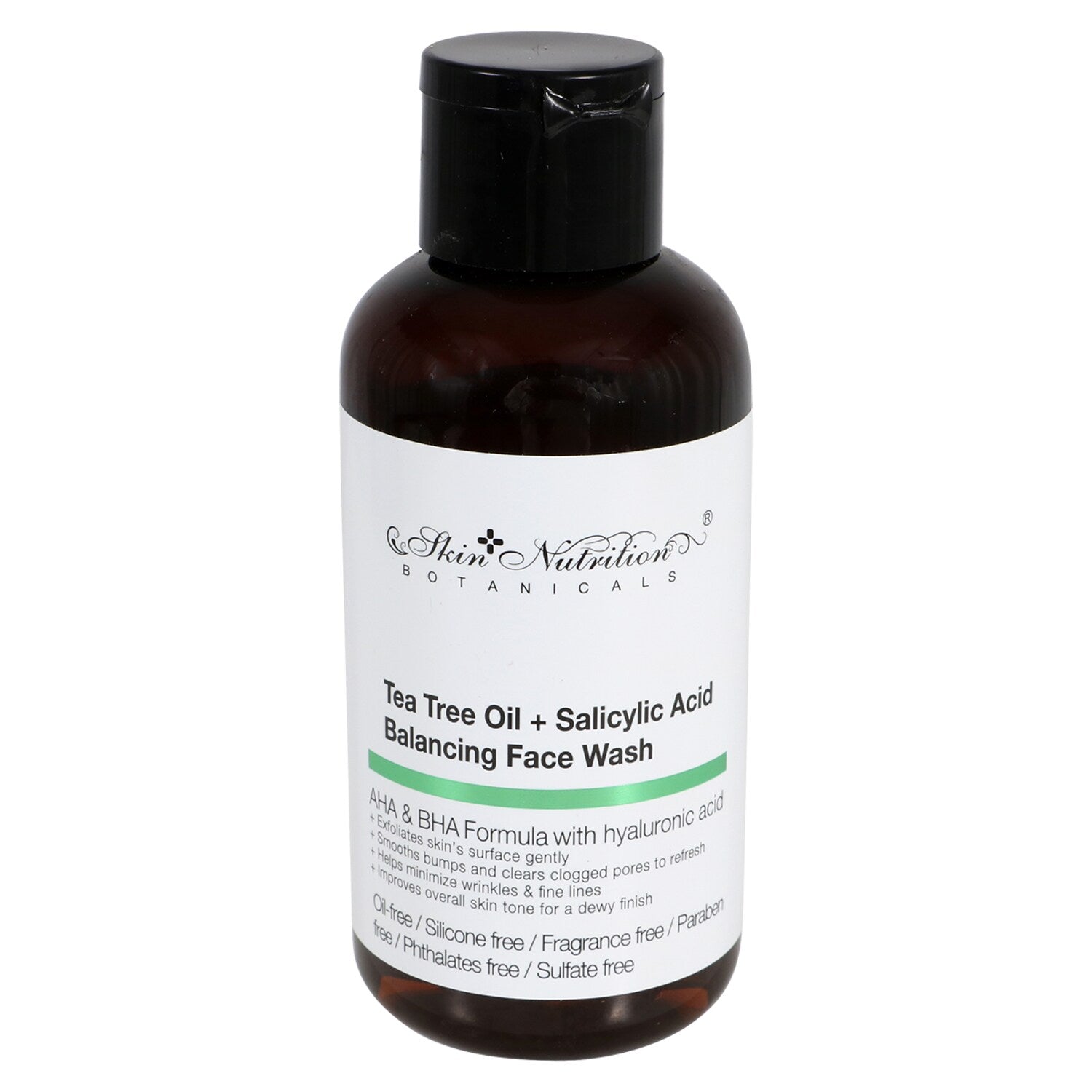Comes with (Pack of 24). Skin Nutrition Botanicals Tea Tree Oil & Salicylic Acid Balancing Face Wash is an AHA & BHA formula with hyaluronic acid which helps in the gentle exfoliating of the skin's surface, smoothing bumps and clearing clogged pores to refresh, help minimize wrinkles and fine lines, and improve the overall appearance of the skin by evening skin tone and creating a dewy finish. This face wash is oil free, silicone free, fragrance free, Paraben free, Phthalates free, and sulfate free.