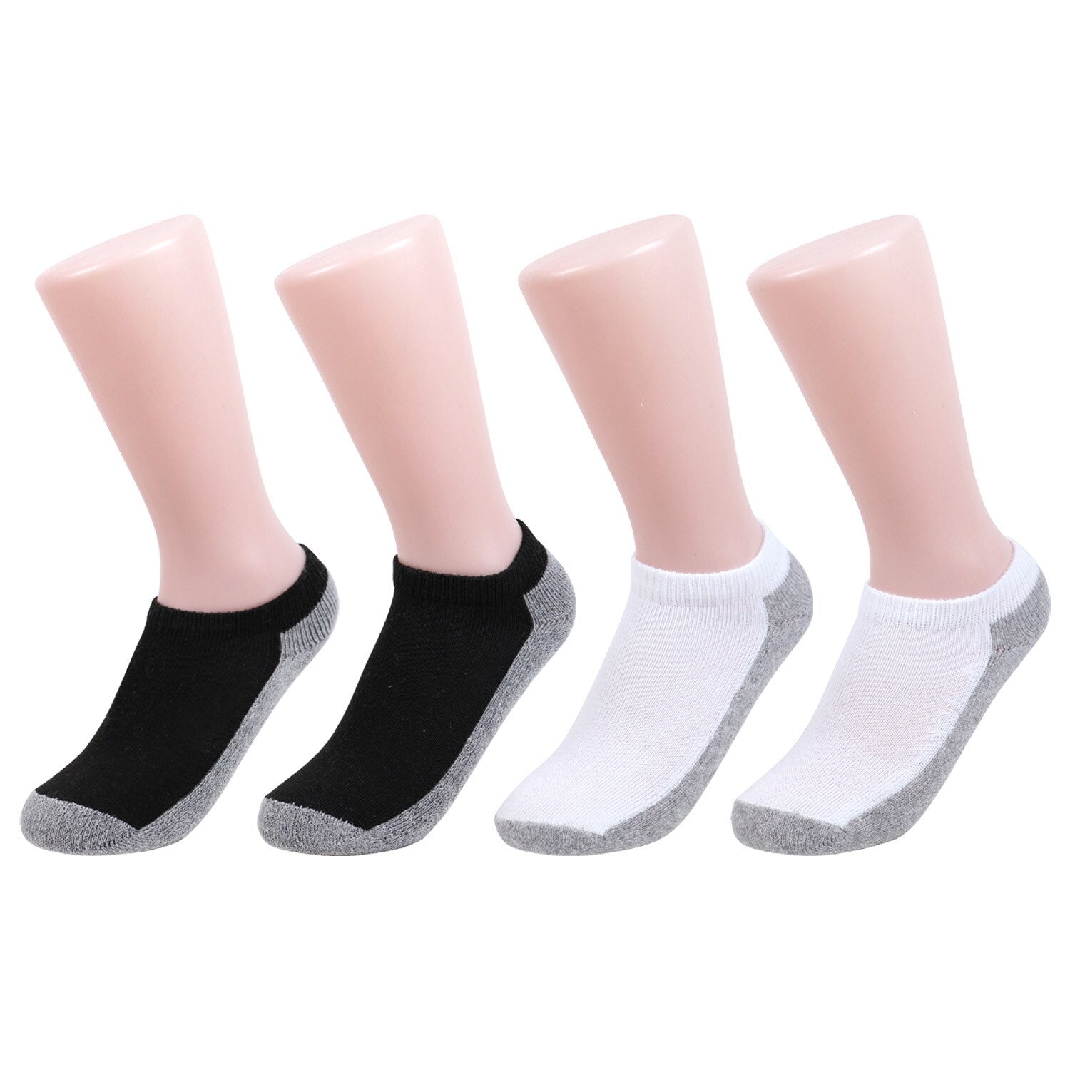 Comes with (Pack of 36). Juncture Kids 1/2 Cushion Lowcut Socks are made from 98% polyester and 2% spandex creating a comfortable fit. Cases include 19 units of black socks and 17 units of white socks, 50% are sock sizes 4-6 and 50% are sock sizes 6-8.