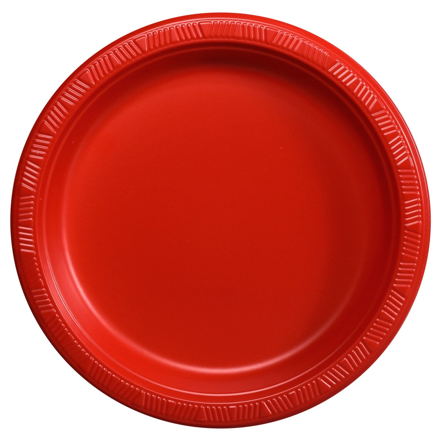 Comes with (Pack of 24). Add a little bold red spice to your next celebration! Sturdy, plastic dinner plate stands up to heavier foods like pasta, meatloaf, fried chicken... almost anything. A great choice for parties and celebrations, picnics, potlucks, church dinners, day care centers, buffet lines, and so much more. Plus, plastic won't leak and make a mess.