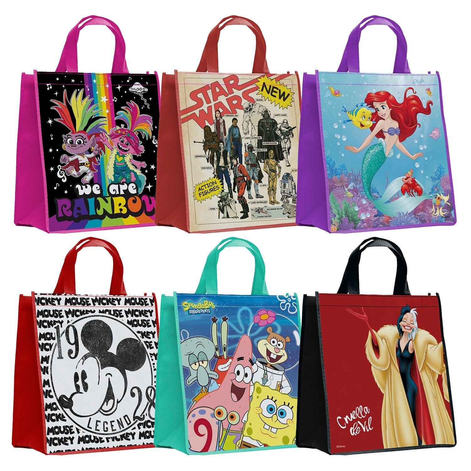 Licensed Character Reusable Tote Bags, 12x13-in. (Pack of 48).Comes with (Pack of 48). Carry your groceries or overnight necessities in these fabulous Licensed Character Reusable Tote Bags! Made with light and durable material, these 12x13-in. totes have 6-in. gussets and come printed with one of six of your favorite characters. Perfect for sleepovers, school supplies, shopping trips, and more! The assortment of six licenses may vary between the three collections shown.
