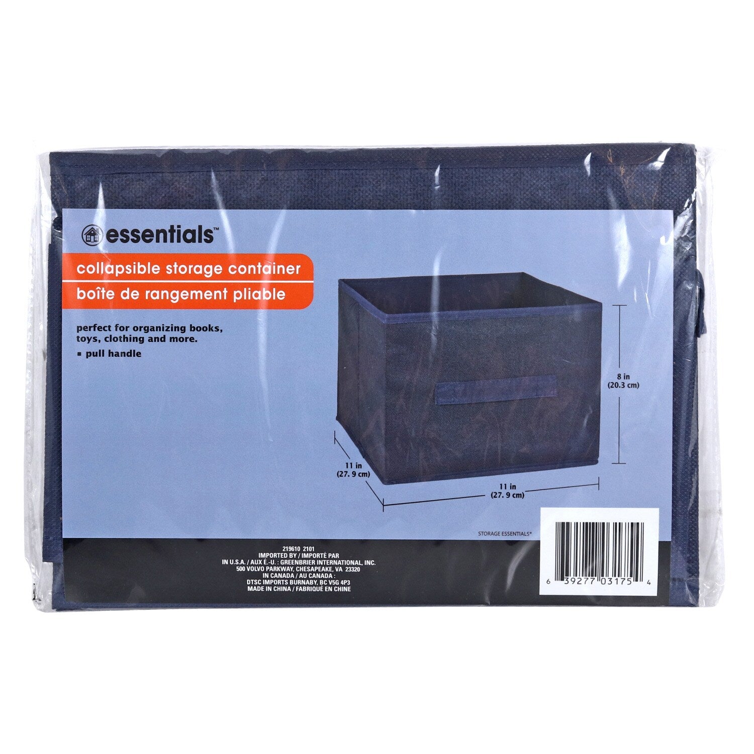 Comes with (Pack of 24). Eliminate clutter and get organized with these Essentials™ Navy Collapsible Storage Containers with Handles! Each collapsible container measures 11x11x8-in. and easily holds books, toys, clothing, craft supplies, sewing essentials, classroom supplies, and other items. Navy storage boxes look great in any room, plus their convenient handles make them easy to pull down off of shelves. Great for playrooms, daycare centers, classrooms, dorm rooms, and more. Assortment may vary.