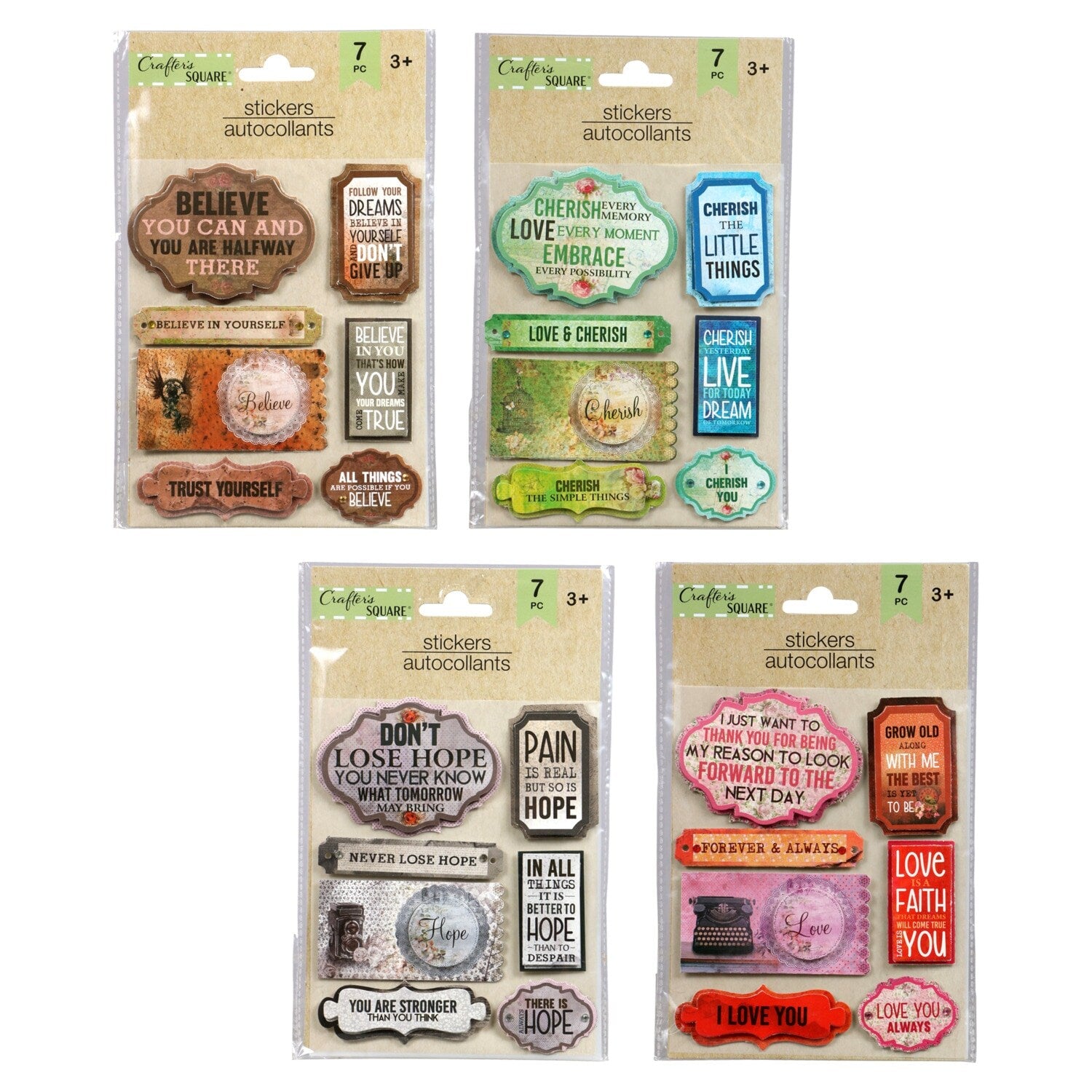 Comes with (Pack of 24). Assortment may vary. Ages 3+ Inspirational stickers provide motivation and encouragement while being lovely to view. The 7-ct. packs are assorted among 4 styles as shown. Decorate gift wrapping, DIY projects, daily planners, scrapbooks, notebooks, luggage, skateboards, refrigerators, lockers, bicycles, helmets, laptops, water bottles, and more.