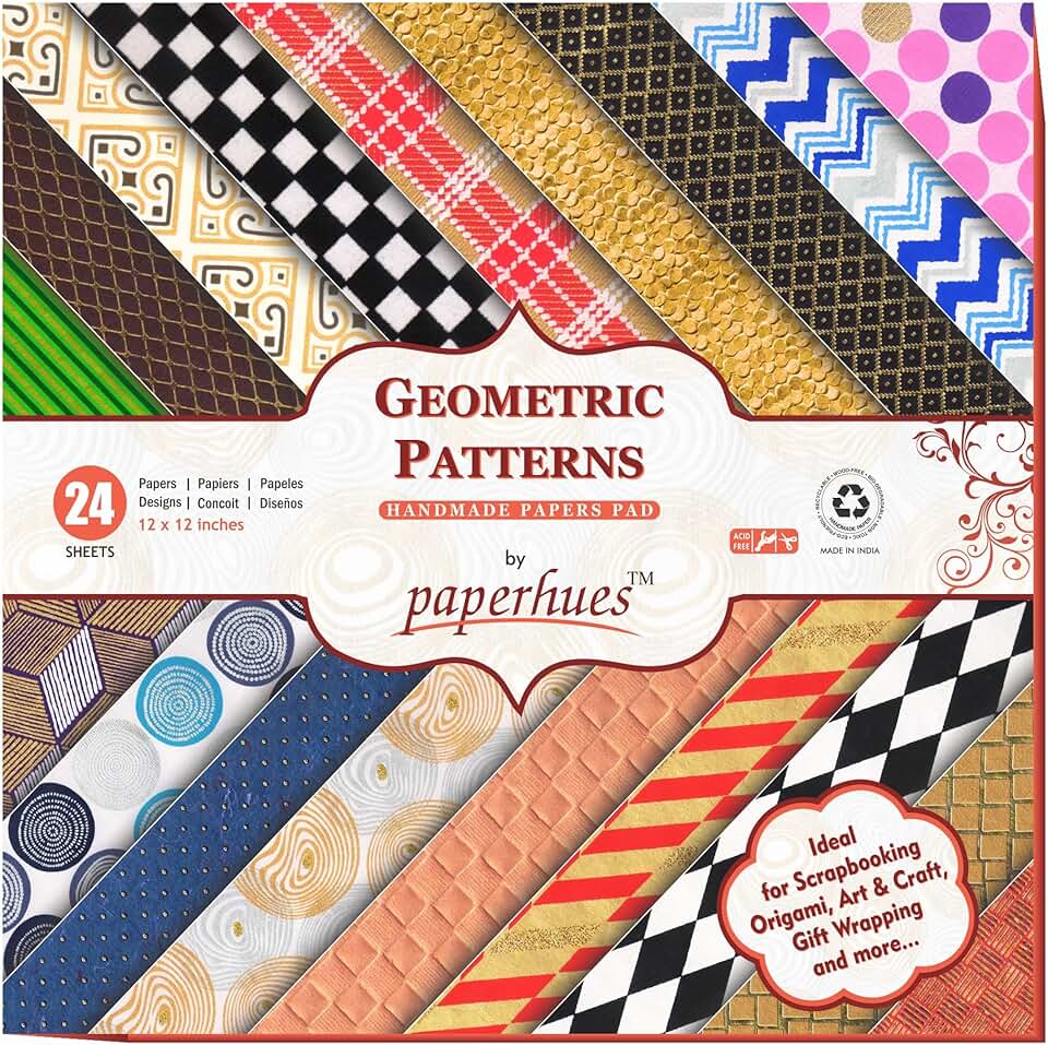 This 12x12-inch scrapbook paper pad features 24 sheets with geometric patterns. The designs are suitable for various craft projects, including scrapbooking, card making, and other paper crafts. The sheets are durable and easy to work with, providing a variety of styles to enhance creative projects.