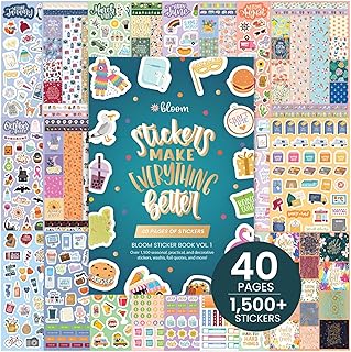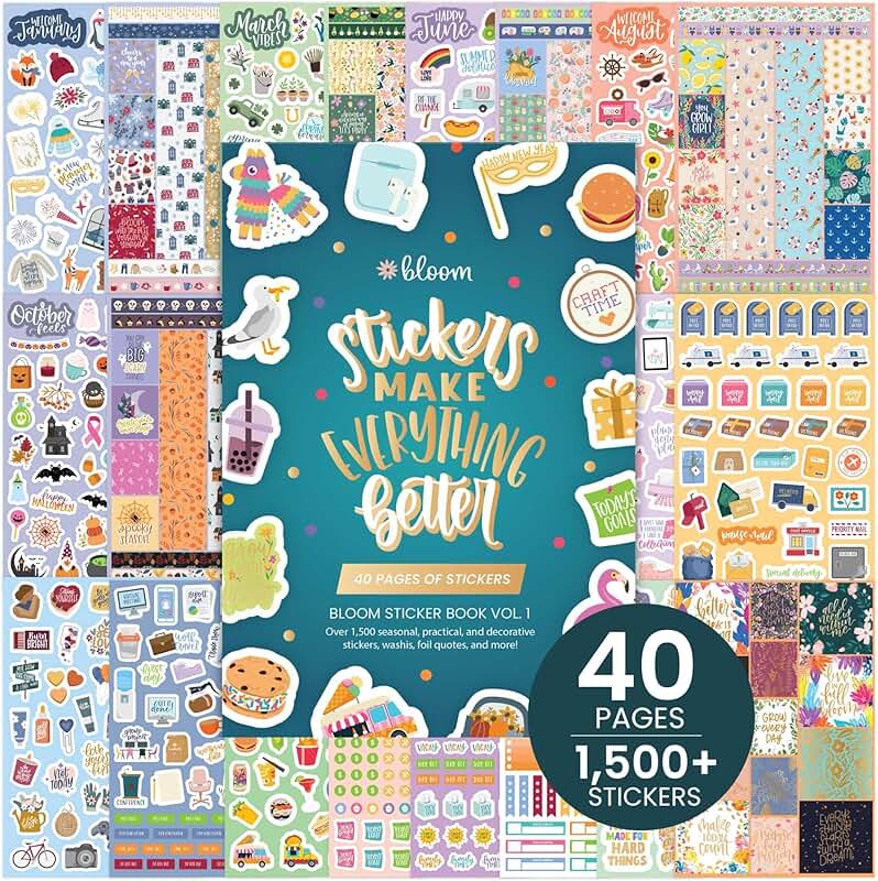 This sticker pack includes over 1,500 stickers on 40 pages, measuring 6 by 9 inches. The bound book features a wide variety of stickers related to seasons, celebrations, holidays, food, travel, quotes, and more. Some stickers have foil accents for added shine. The collection offers a diverse selection suitable for personalizing planners, journals, or crafts. The pages are designed for easy removal and use, making it simple to decorate and customize your projects. The variety ensures there are stickers for many occasions and themes, providing creative options for organization and decoration.
