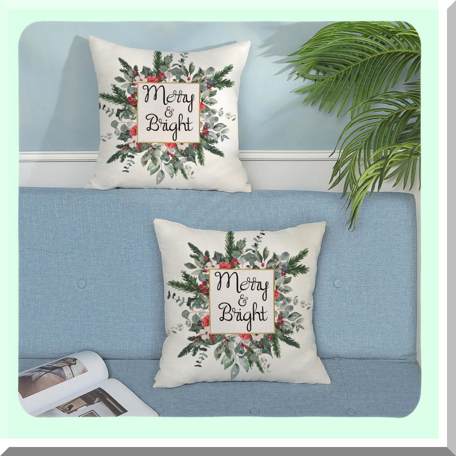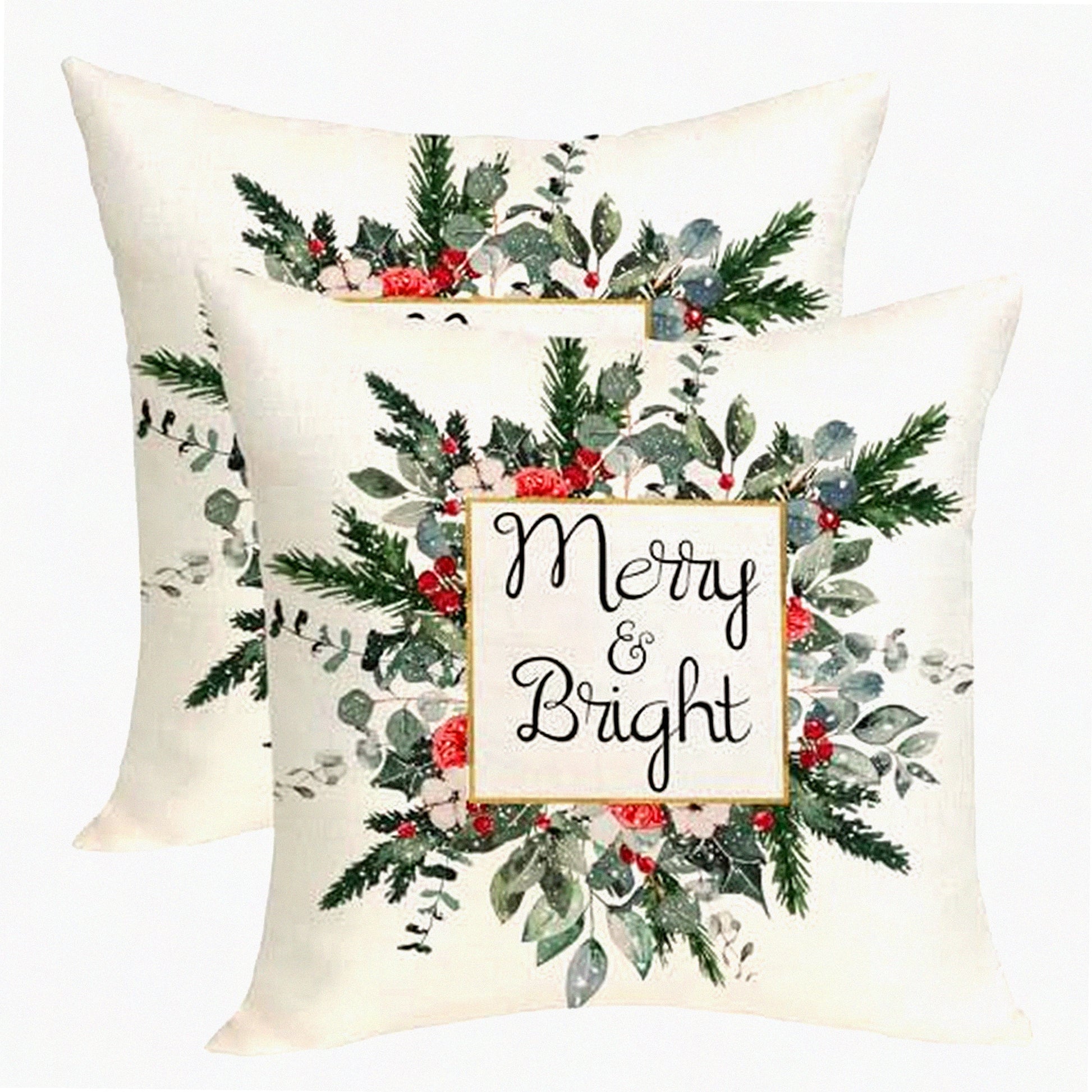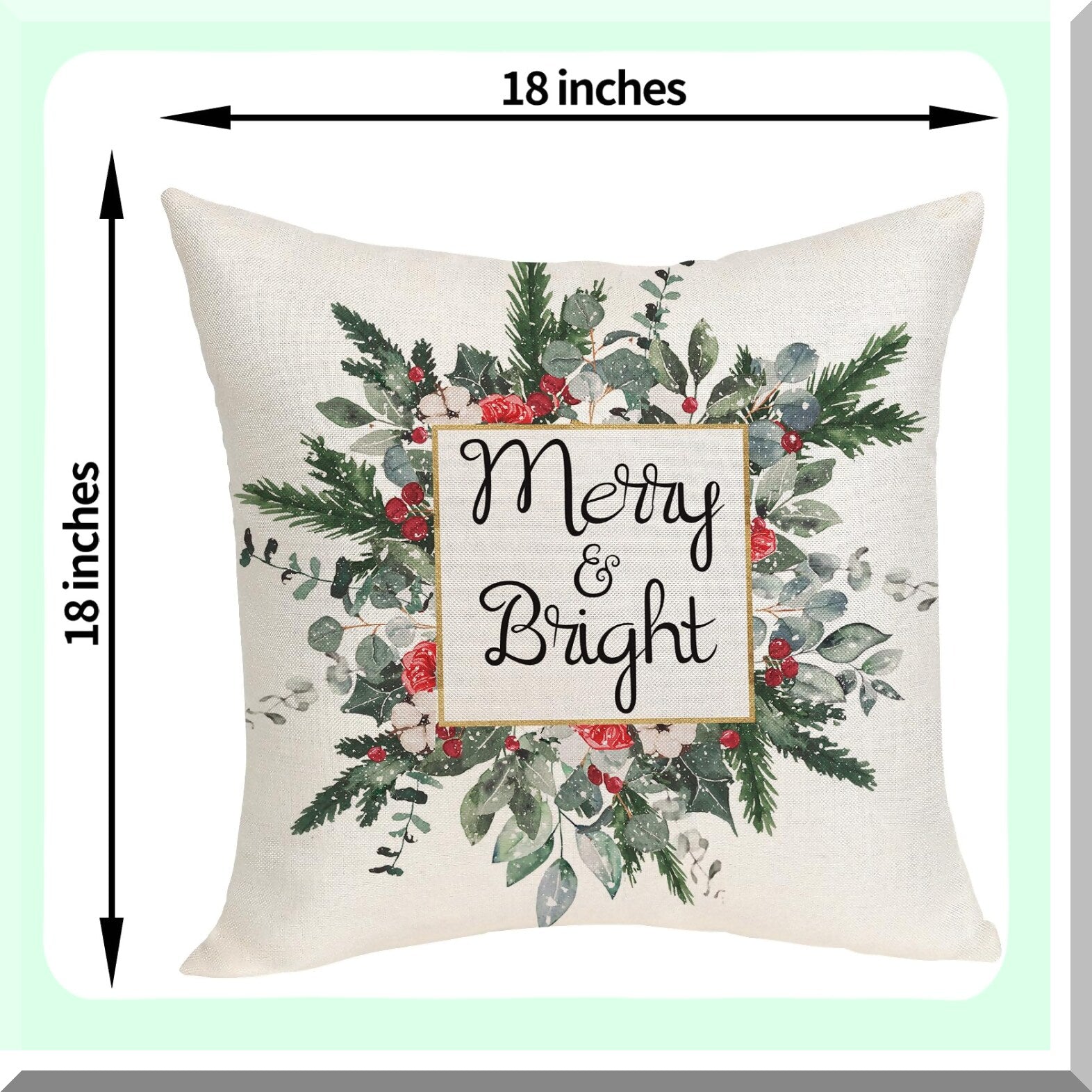 Winter Greenery Pillow Covers - Set of 2 Mistletoe Eucalyptus Leaf Garland Throw Pillowcases | Farmhouse Linen Cushion Cases for Sofa, Couch, Bed - 18x18