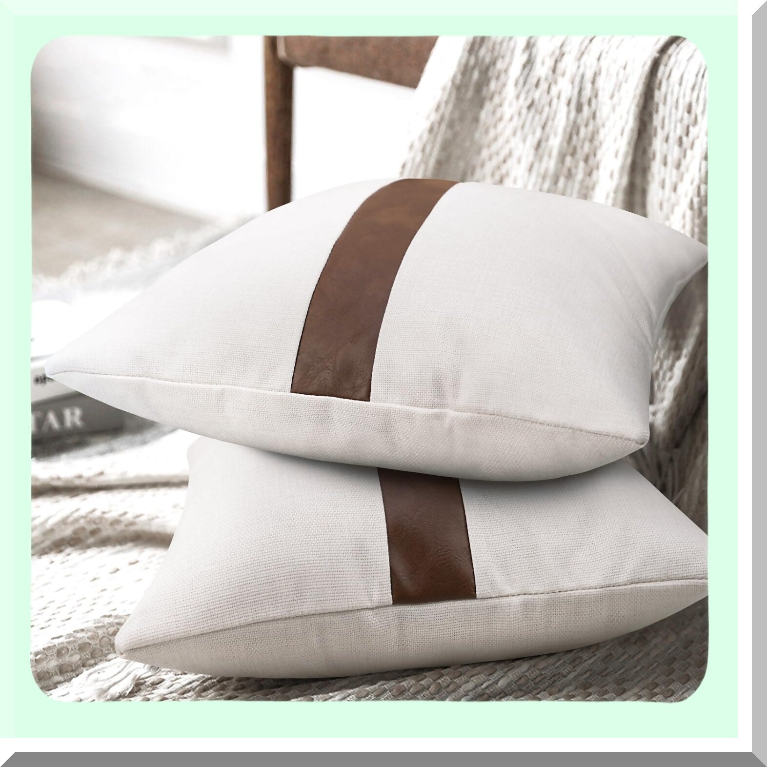 Linen Leather Patchwork Throw Pillow Covers - Set of 2 Modern Accent Decor Square 22x22 inch, Brown & White for Couch Living Room Bedroom