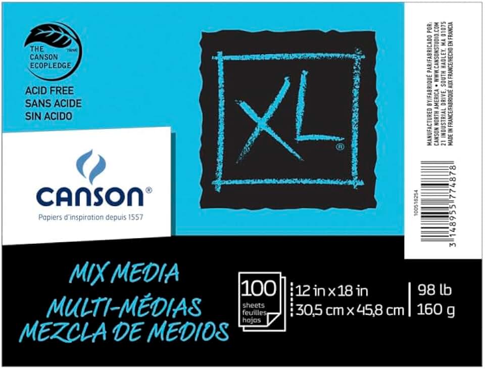 This set includes 100 sheets of mixed media paper, each measuring 12 by 18 inches and weighing 98 pounds. The paper is white and suitable for various artistic techniques, providing a durable surface for drawing, painting, and mixed media projects.