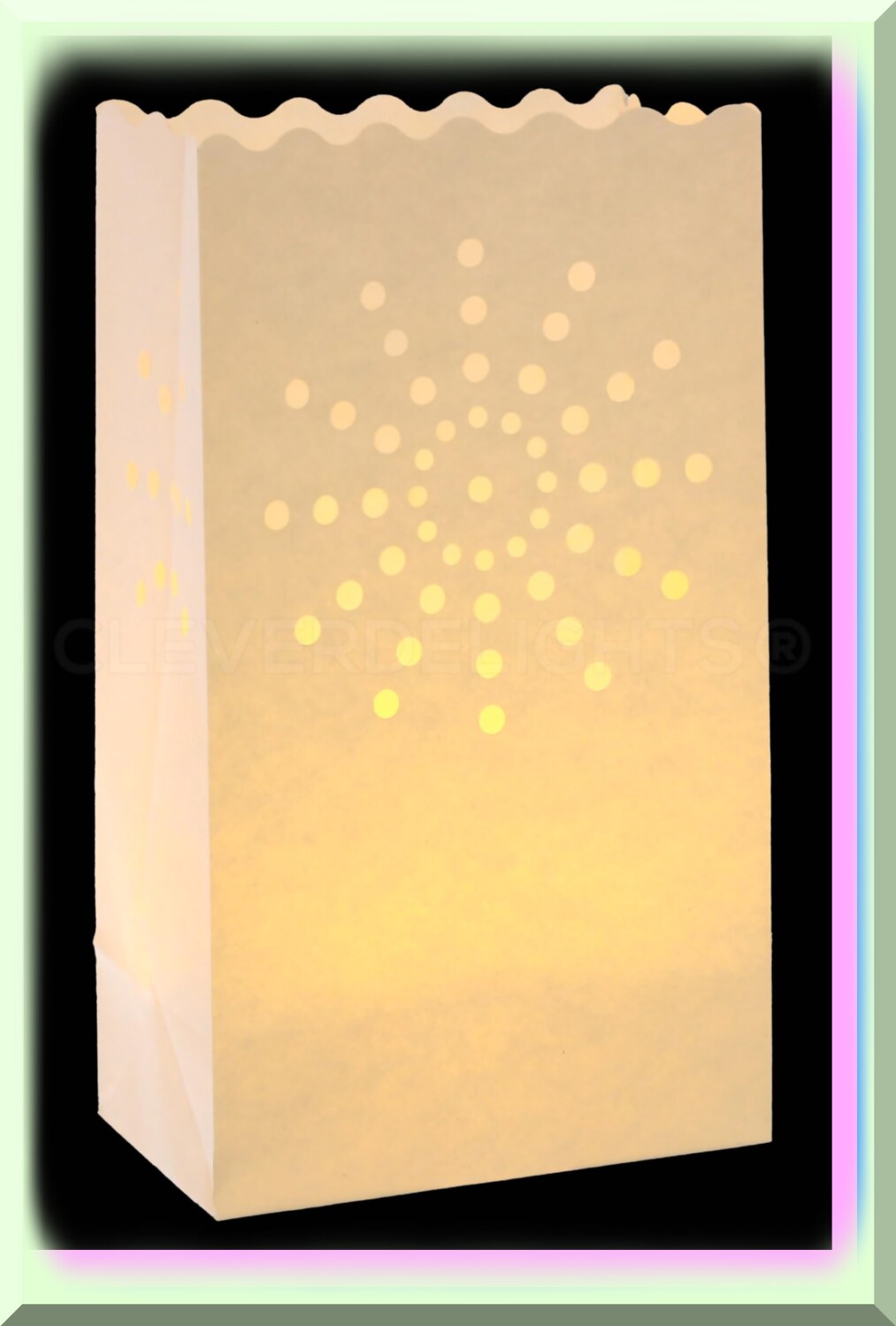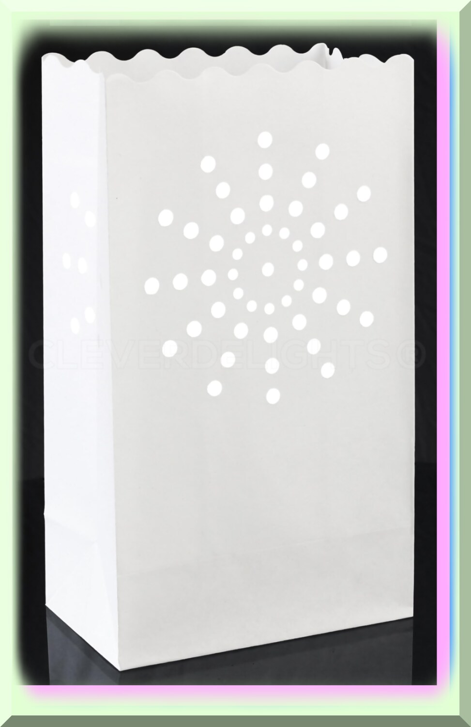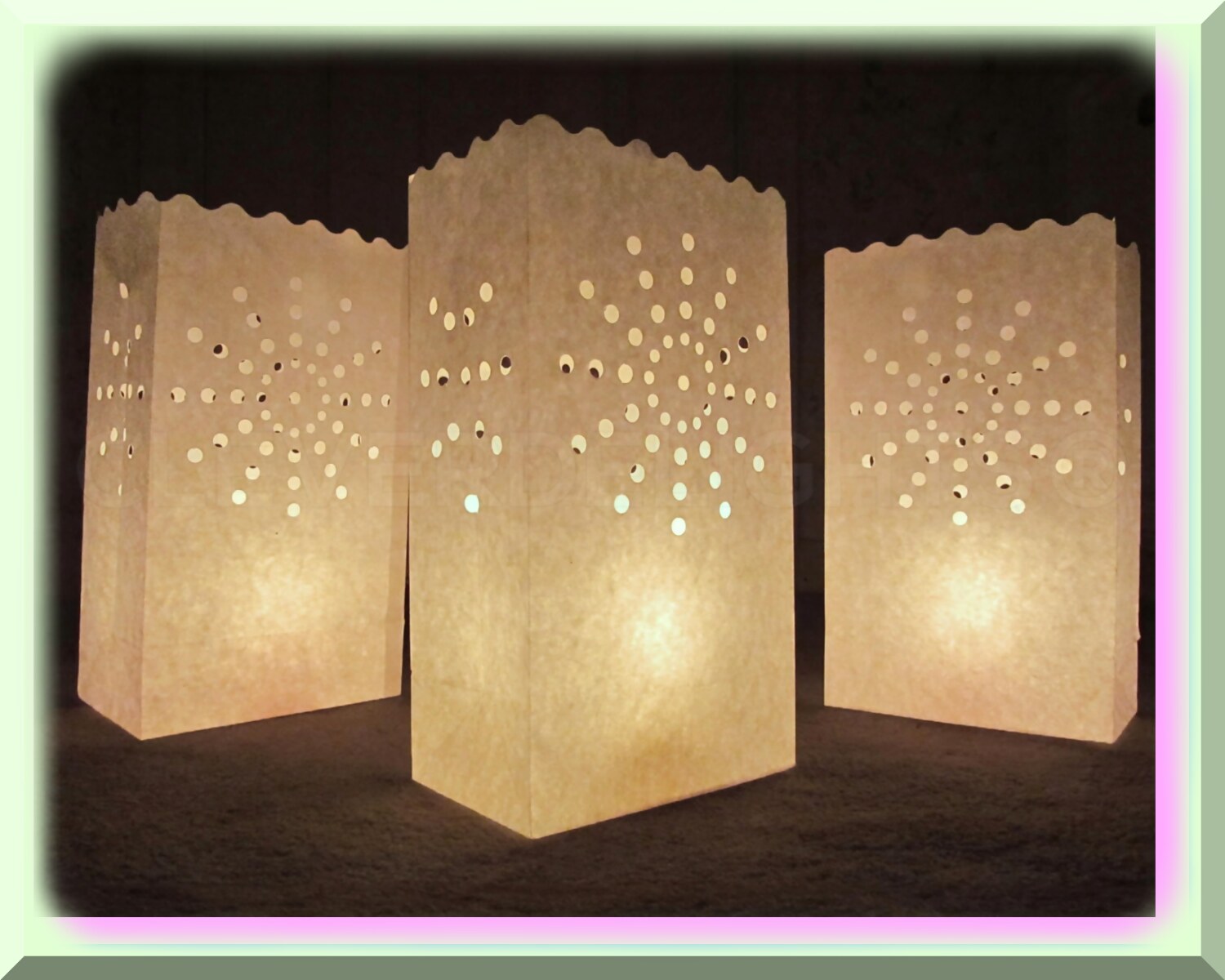 Illuminate your event with these white sunburst luminary bags, perfect for weddings, parties, and holiday decor. This 10-pack features flame-resistant paper for safe indoor and outdoor use. Each bag measures 10" high, 6" wide, and 3.5" deep, providing ample space for various lighting options such as LED tealights or fairy lights (not included). The intricate sunburst pattern adds an elegant touch, enhancing the atmosphere with a mesmerizing glow. Crafted from high-quality, durable materials, these bags are designed for reuse, maintaining their pristine appearance over multiple celebrations. For outdoor settings, adding a small amount of sand or rocks can prevent tipping in the wind. Easy to set up, simply unfold the bags, insert your light source, and create a magical ambiance effortlessly. These luminary bags are a versatile and stylish choice to elevate any special occasion, offering a sophisticated glow that captivates guests.