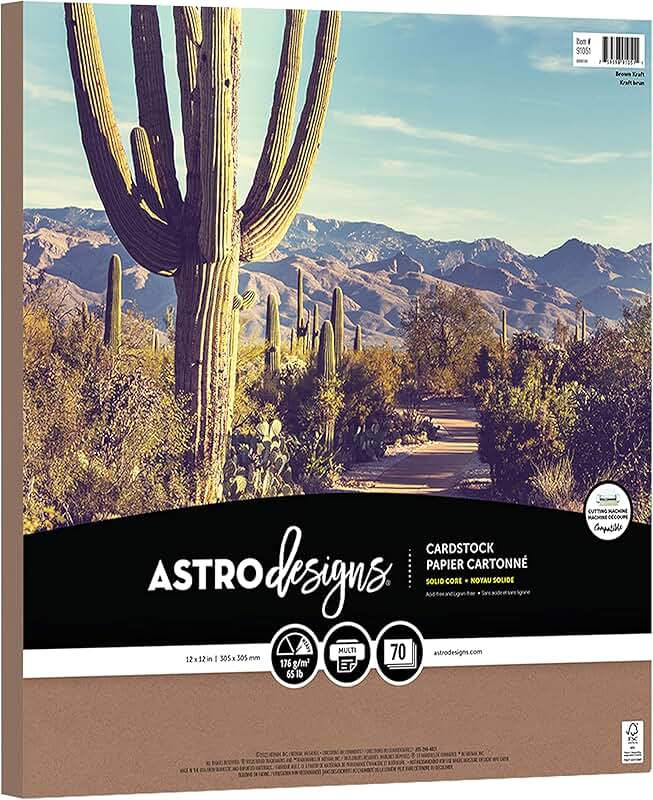 A pack of 70 sheets of kraft cardstock, each measuring 12 inches by 12 inches and weighing 65 pounds or 176 grams per square meter. The sturdy paper is suitable for various craft projects, providing a durable surface for cutting, folding, and decorating.