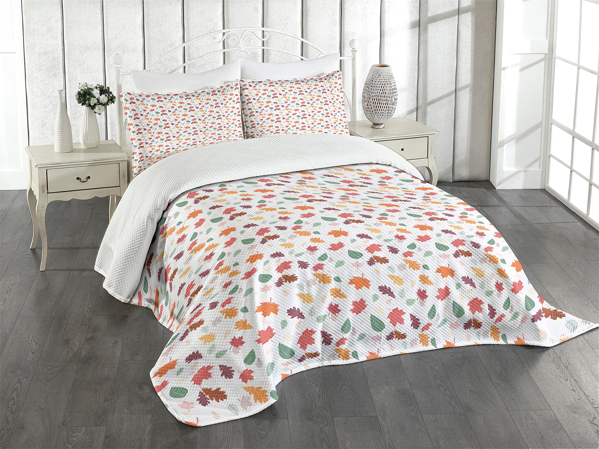 Fall Leaves Bedspread, Hand Dr n Leaves Pattern Autumn Shades October Vibes and Floral, Decorative Quilted 3 Piece Coverlet Set with 2 Pillow Shams, Queen Size, Maroon Teal