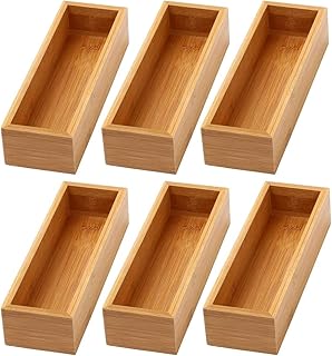 This set of six bamboo drawer organizers measures 3x9x2 inches each, providing a practical solution for organizing various spaces. Made from natural bamboo, these storage boxes are durable and eco-friendly. They are suitable for use in kitchen drawers, junk drawers, offices, bedrooms, children’s rooms, craft areas, sewing spaces, and bathrooms. The compact size helps to keep small items neatly arranged, reducing clutter and improving accessibility. Their simple design allows for easy placement and removal, making organization straightforward. These versatile boxes are ideal for storing utensils, stationery, toiletries, craft supplies, or small household items. The natural bamboo material adds a warm, aesthetic touch to any space while offering a sturdy and lightweight storage option. Easy to clean and maintain, these organizers are a practical addition to any home or workspace seeking efficient storage solutions.