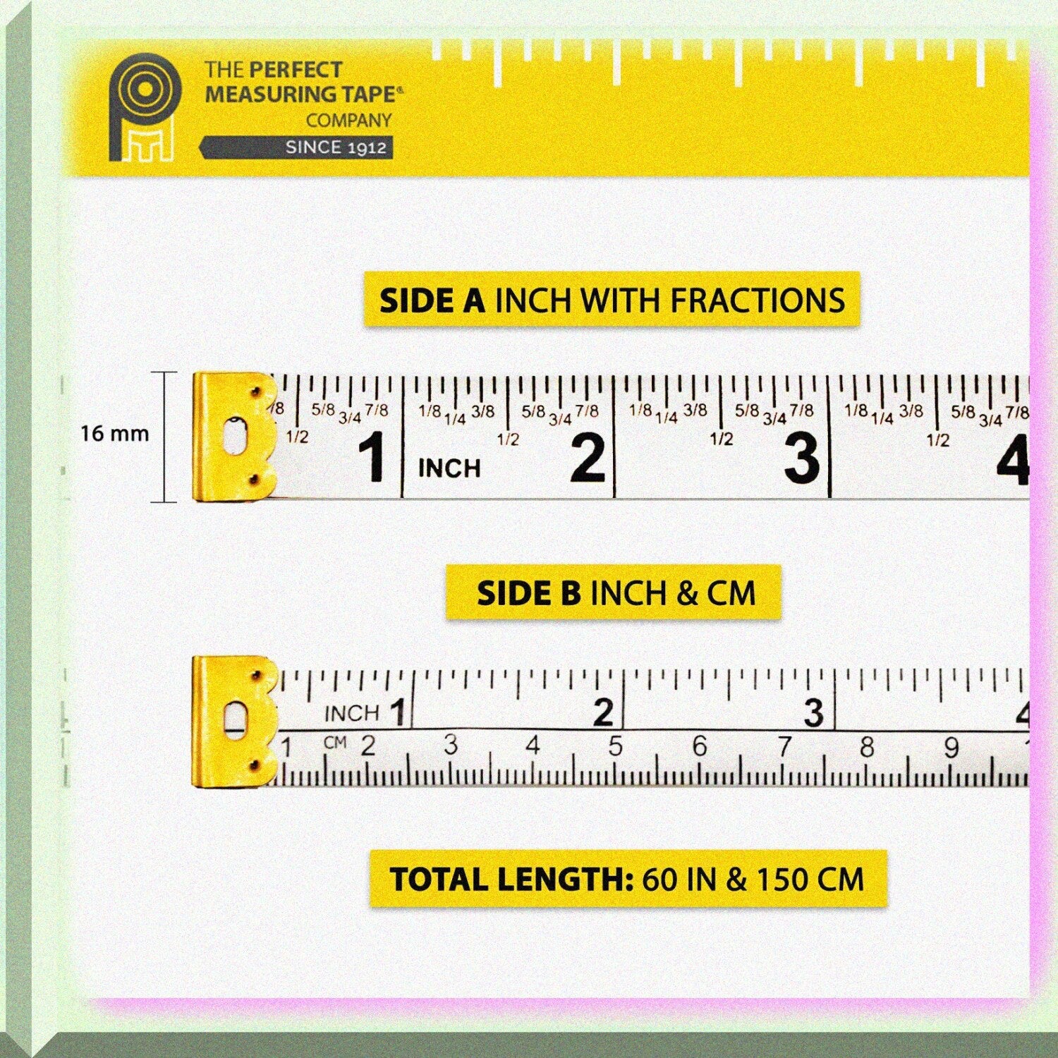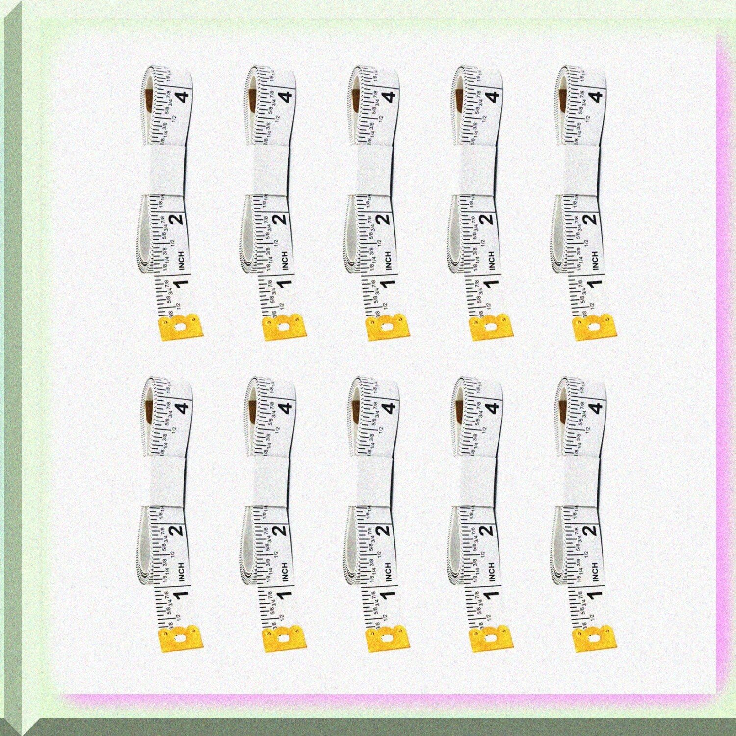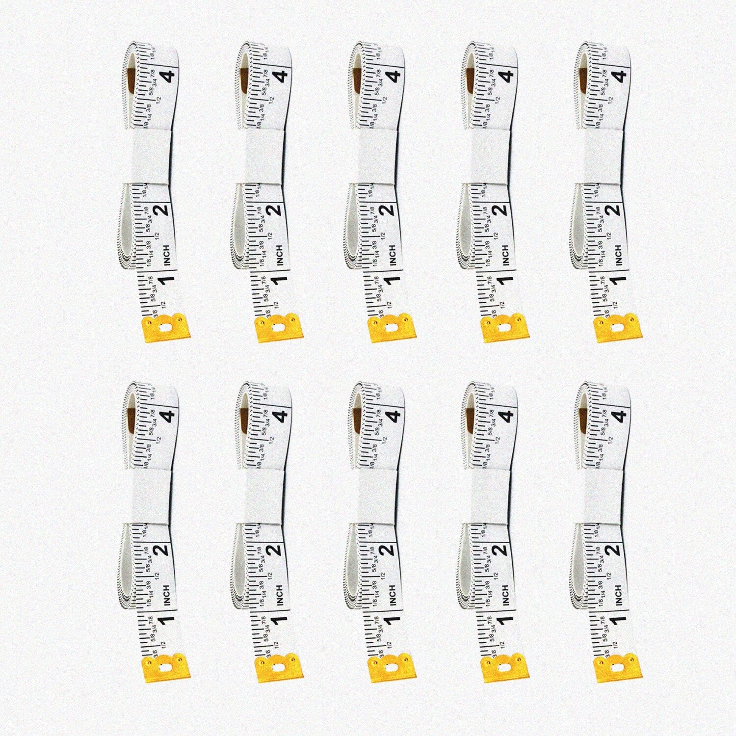 The DualScale Ruler Set includes 10 double-sided measuring tapes, each 60 inches long and white in color. Designed for precision, these tapes feature clear fractional inch markings alongside standard measurements, eliminating the need to count small increments or strain your eyes. One side displays large, easy-to-read inch measurements down to 1/16 inch, with fractional inches marked clearly beside the graduation marks. The opposite side offers split-scale inches and metric measurements down to millimeters. Each tape is 5/8 inch (16 mm) wide, slightly wider than standard tailor tapes, providing enhanced visibility. Made from durable, soft, wear-resistant, and non-stretch vinyl-coated fiberglass, they maintain flexibility and accuracy over time. The tapes are neatly fan-folded and secured with a reusable cardboard band, making them convenient for tailoring, sewing, or tracking fitness and dieting results. Metal end pieces ensure durability, and the tapes are suitable for travel or everyday use.