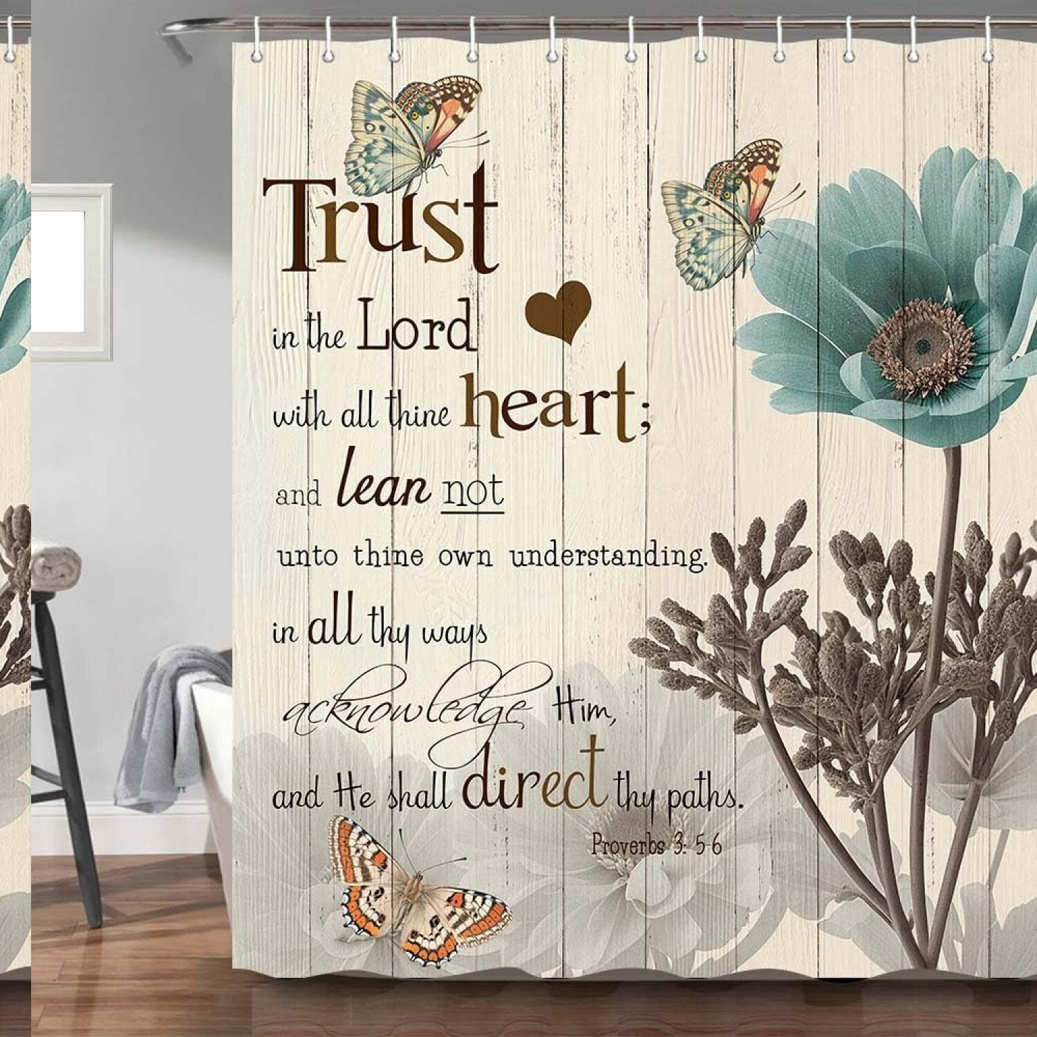 This vintage farmhouse-style shower curtain measures 60 inches wide by 70 inches long, crafted from waterproof polyester fabric. Its beige background features an elegant teal tulip design complemented by an inspirational Bible verse quote, adding a touch of rustic elegance to your bathroom decor. The set includes 12 durable plastic hooks for easy installation. Designed to suit most bathrooms and tubs, this curtain offers a charming floral accent that enhances your space with a vintage feel. Please note that slight creases may appear and can be smoothed with light ironing. Due to manual measurement, there may be a 1-3cm error, and color variations may occur depending on monitor settings. This versatile curtain not only beautifies your bathroom but also makes a thoughtful gift for loved ones. We stand behind our product quality and offer a money-back guarantee if you are not satisfied.