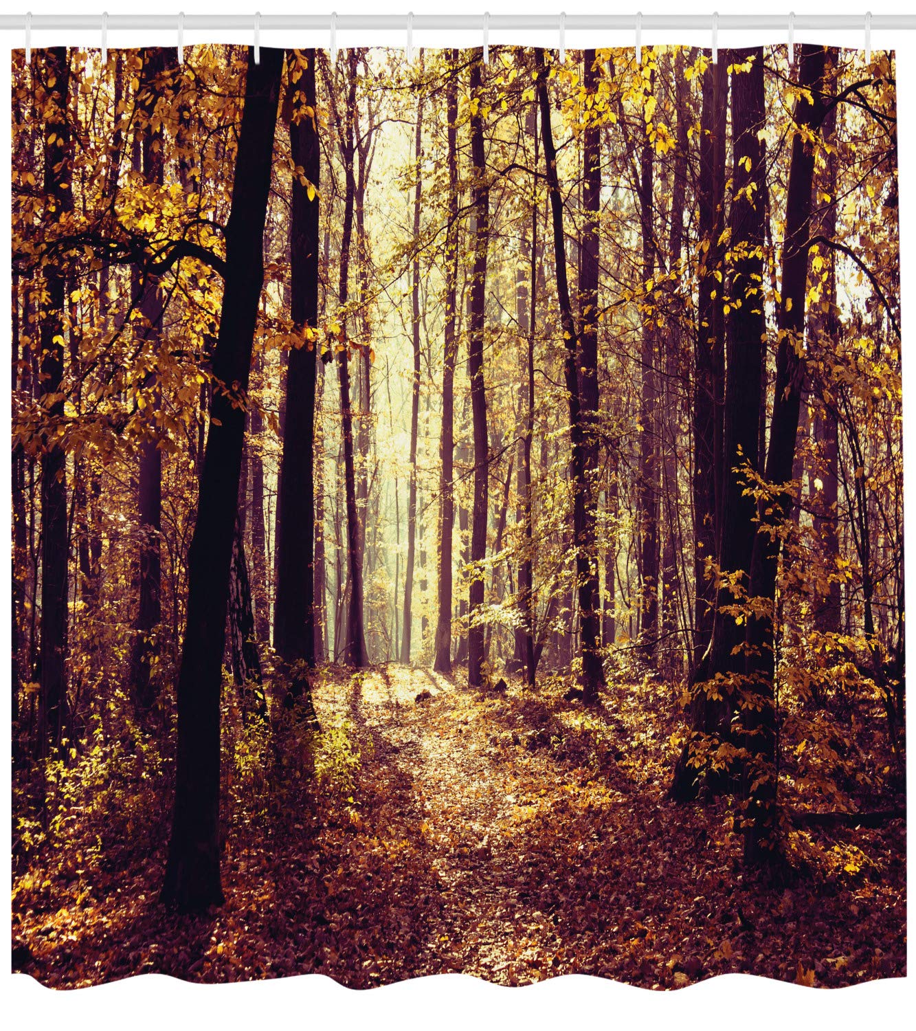 Forest Shower Curtain, Mys ous Atmosphere Misty Woods Tree Nature Landscape Image, Cloth Fabric Bathroom Decor Set with Hooks, 69" W x 84" L, Olive Brown