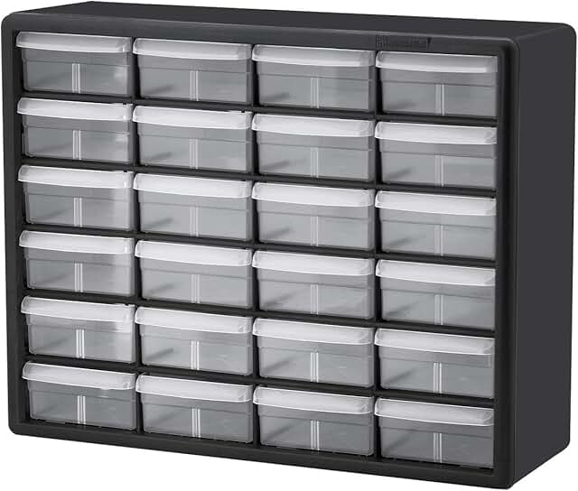 This 24-drawer plastic storage cabinet offers versatile organization for various needs. Its compact design measures 20 inches wide, 6 inches deep, and 16 inches high, making it suitable for garages, workshops, classrooms, or personal spaces. The cabinet features 24 individual drawers that provide ample space for storing small items such as beads, building bricks, tools, or makeup. The durable plastic construction ensures long-lasting use and easy maintenance. The drawers are designed for easy access and organization, helping to keep items neatly sorted and readily available. Its sturdy build and practical layout make it a convenient solution for managing clutter and optimizing storage space. The black finish adds a sleek, neutral look that fits well in different environments. Whether used for hobby supplies, educational materials, or personal accessories, this storage cabinet helps maintain an organized and tidy area.
