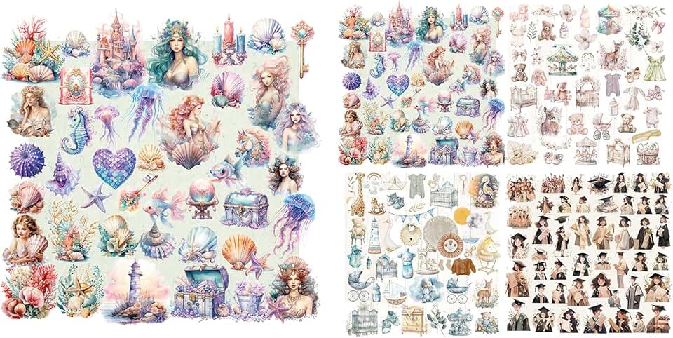 This set includes five packs of junk journal supplies and scrapbooking materials. It features translucent stickers and vintage-style ephemera with designs inspired by mermaids and themes of life and growth. The collection offers a variety of decorative elements suitable for enhancing journal pages and creative projects. The items are designed to add a touch of charm and nostalgia, making them ideal for craft enthusiasts who enjoy vintage and maritime-inspired motifs. Each pack provides different pieces to inspire creativity and personalize your journals or scrapbooks.