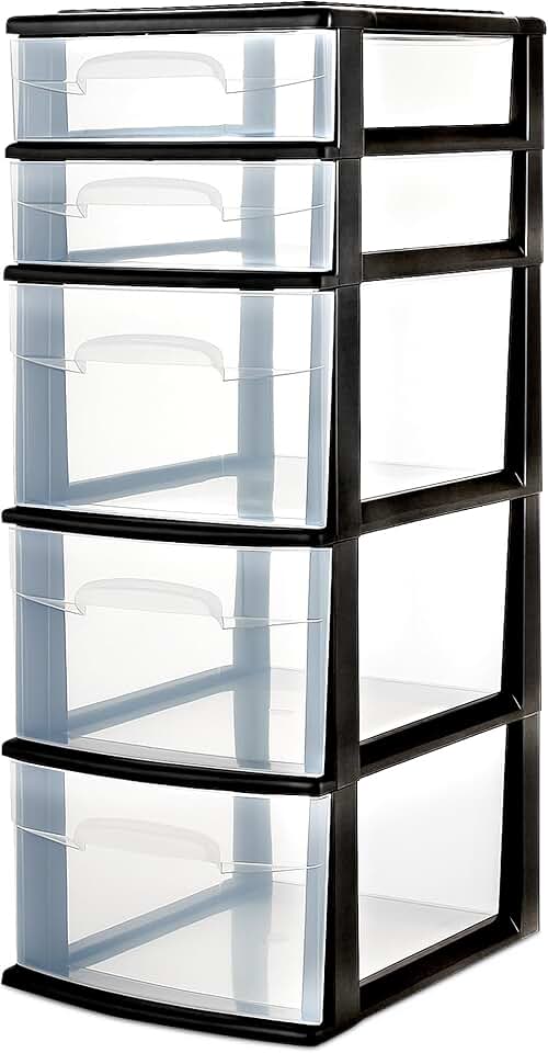 A 5-tier clear plastic storage organizer with a black frame, designed for versatile use in bedrooms, bathrooms, and offices. This drawer tower provides ample space for organizing various items, helping to keep spaces tidy and clutter-free. The transparent drawers allow easy identification of contents, making retrieval simple. Its sturdy construction ensures durability and stability during daily use. The compact design fits well on desks, countertops, or shelves, maximizing storage efficiency. Ideal for storing office supplies, toiletries, craft materials, or small household items. The unit's sleek appearance complements different decor styles, adding a functional and organized touch to any room. Easy to assemble and maintain, this multi-purpose container enhances organization and accessibility in multiple settings.