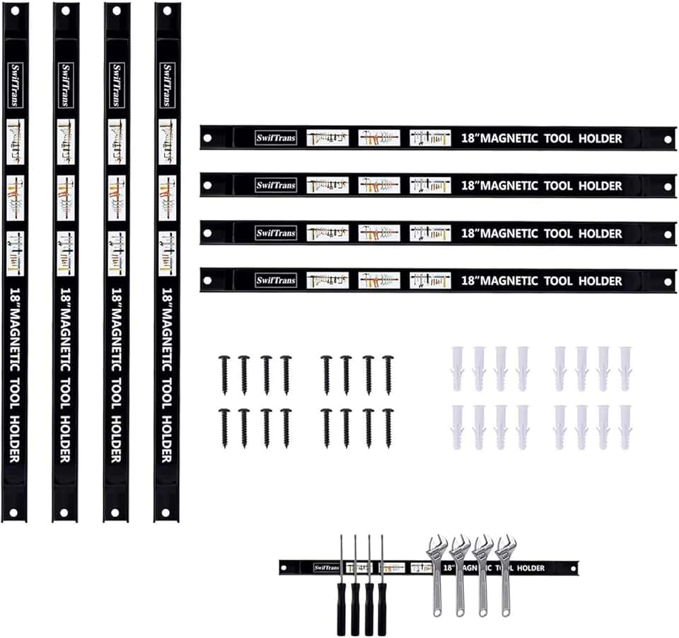This set includes eight heavy-duty magnetic tool holders, each measuring 18 inches in length. Designed for durability, these magnetic strips securely hold a variety of tools and metal objects, helping to organize workspaces efficiently. The strong magnets ensure tools stay in place during use, reducing clutter and increasing accessibility. Easy to mount on walls, these tool bars are suitable for garages, workshops, or storage areas. Their robust construction provides reliable support for everyday tool management. The sleek design allows for a neat and tidy display of tools, making it simple to find and access items quickly. Ideal for professionals and DIY enthusiasts alike, these magnetic tool holders enhance organization and workflow. The set offers a practical solution for maintaining a clean, efficient workspace with a focus on durability and ease of use.