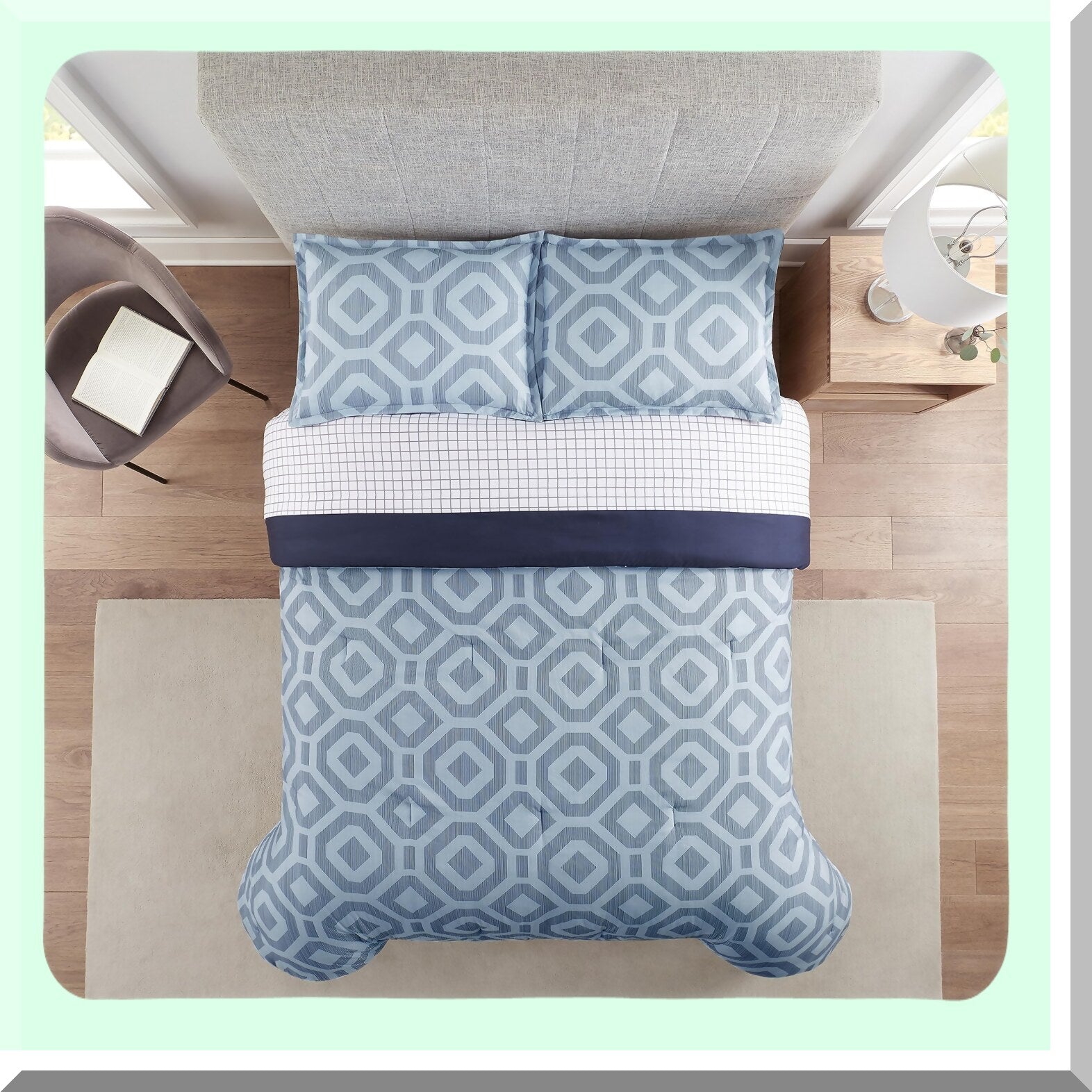 SkylerSoft Geometric 5-Piece Bed in A Bag Set - Complete Comforter Set with Sheets & Pillowcase - All Season Twin XL Bedding - Simply Clean Blue