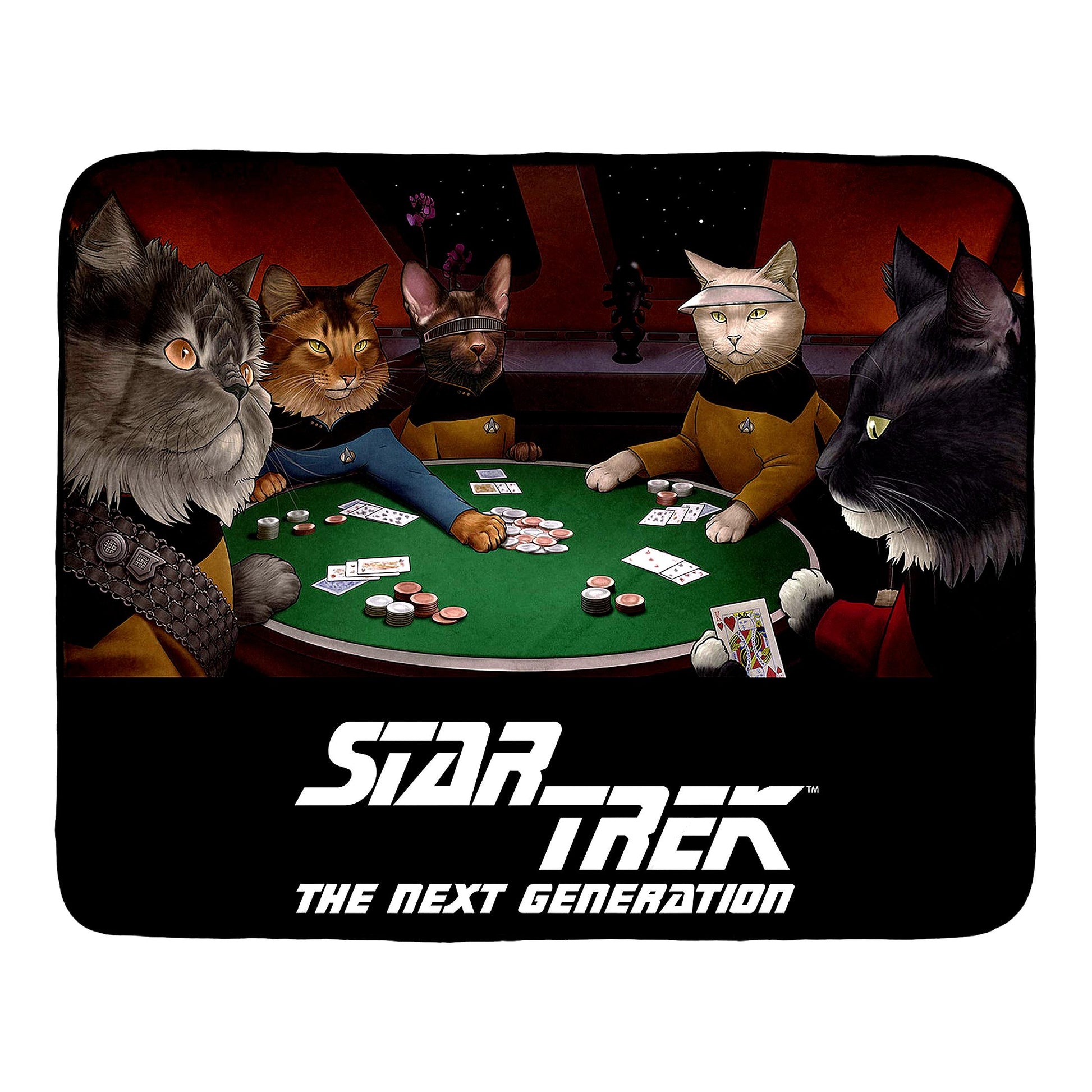 Embark on a cozy journey through the final frontier with this Officially Licensed Star Trek throw blanket! Featuring a super unique design of 5 Star Trek Cat characters playing cards, this Minky plush blanket is a must-have for any fan of the series. Made of ultra-soft 100% polyester fabric, it is perfect for snuggling up on the couch, bed, or even taking on picnics. Dive into the world of TNG as you try to recognize which Star Trek character each cat is designed after. Boldly go where no blanket has gone before with this one-of-a-kind piece that is sure to delight any Trekkie!