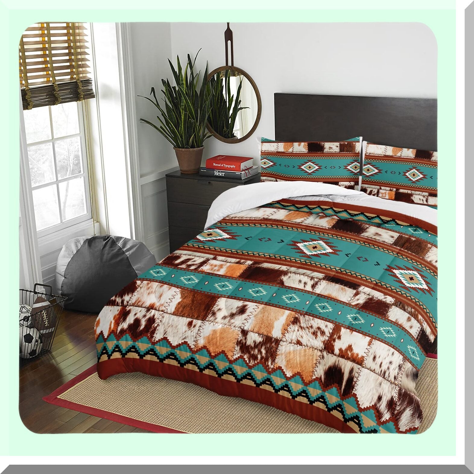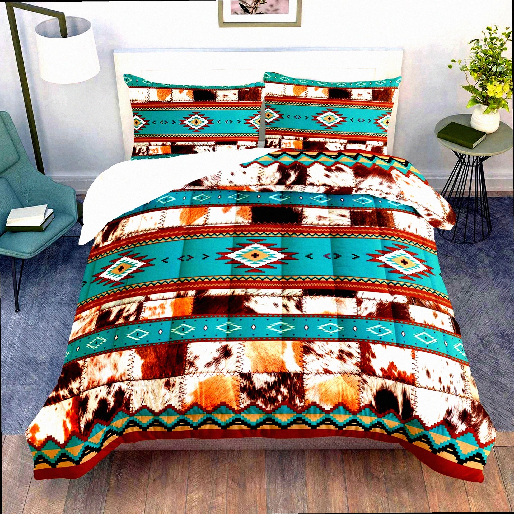 Cowhide Comforter Set - Full Size Geometric Tribal Theme - White Brown Hair Texture Bedding - 3 Piece Duvet Set with Quilt and Pillowcases