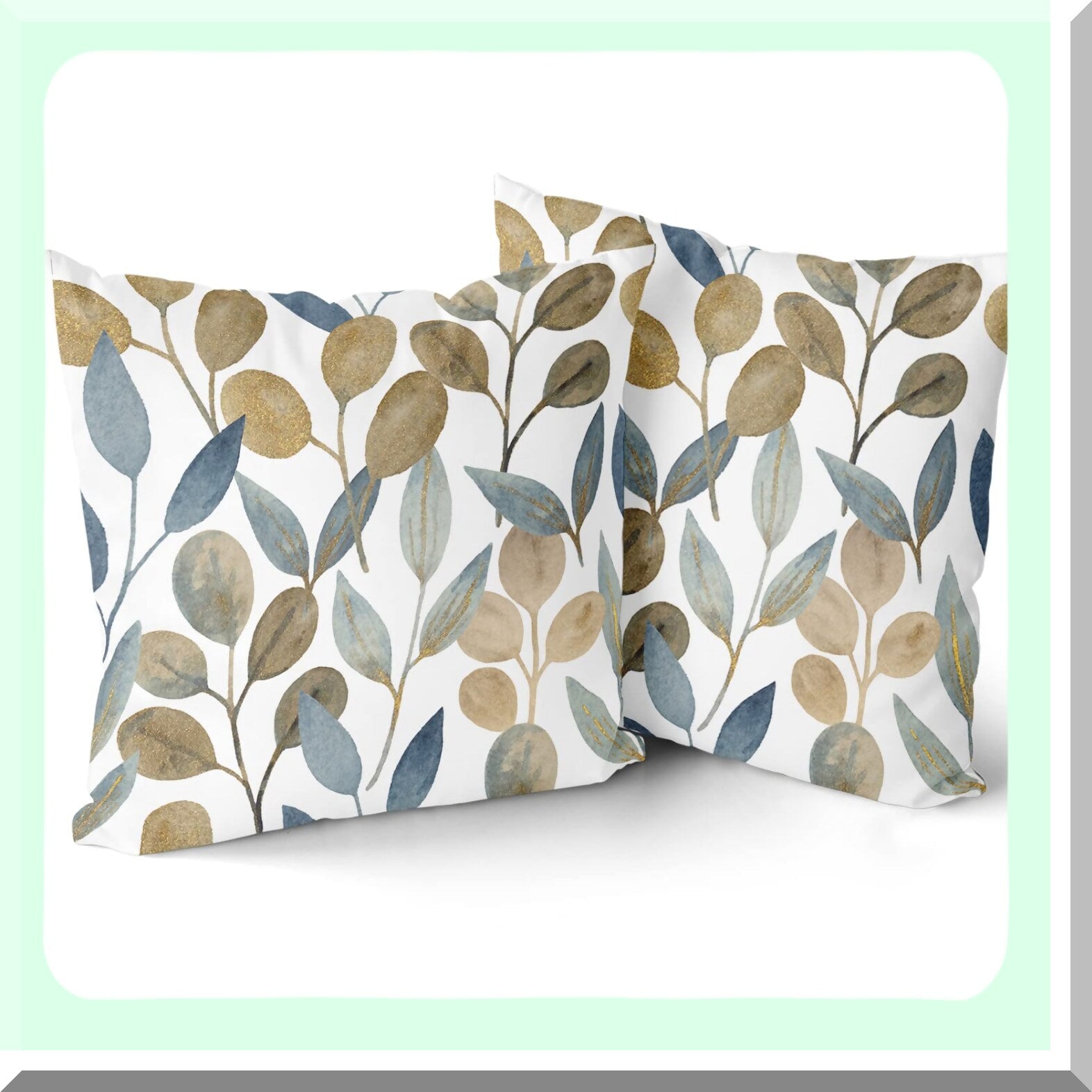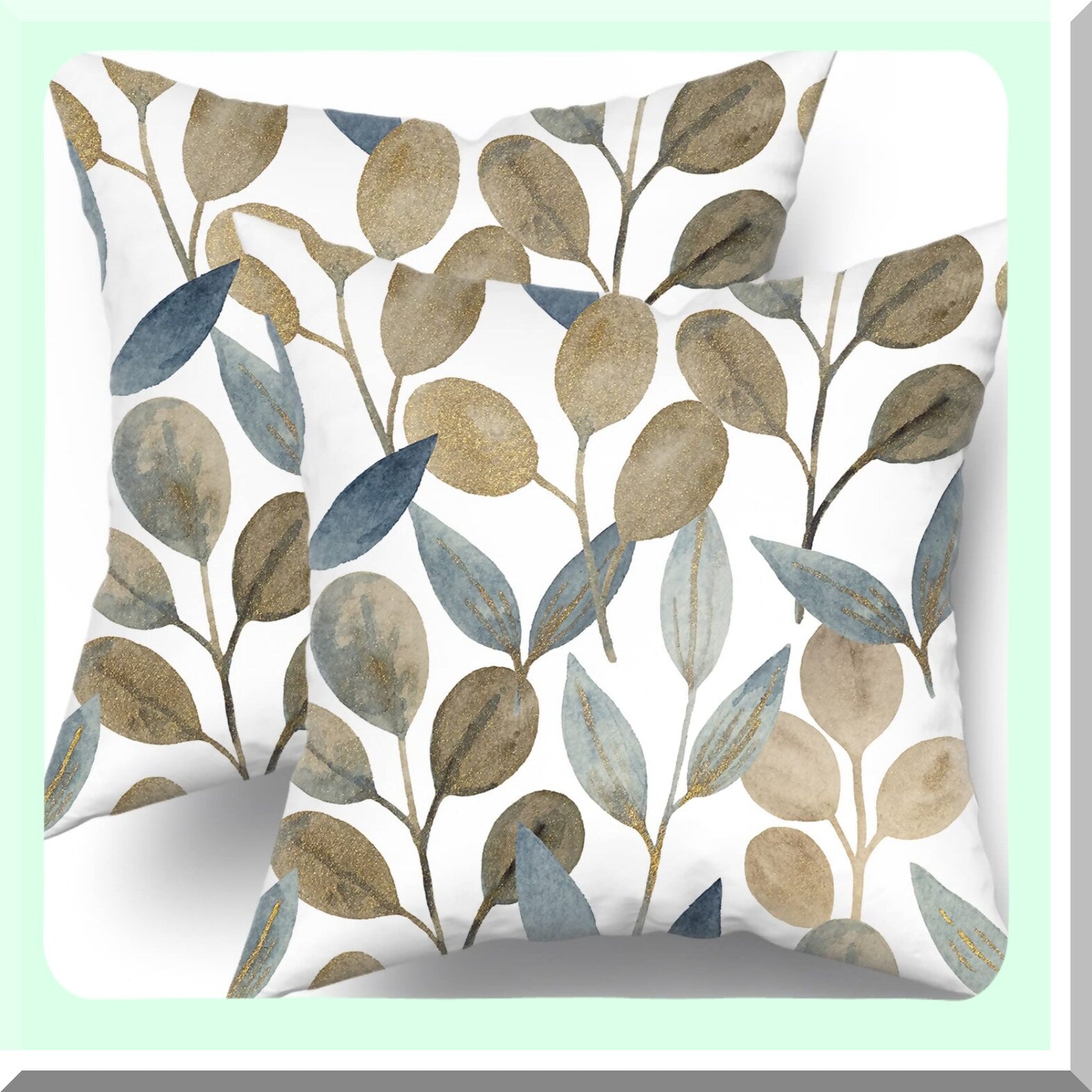 Eucalyptus Gold Leaf Spring Pillow Covers - Set of 2, Watercolor Blue Gray Leaves Throw Pillows - Modern Decor for Bed Couch Sofa Living Room - Gifts