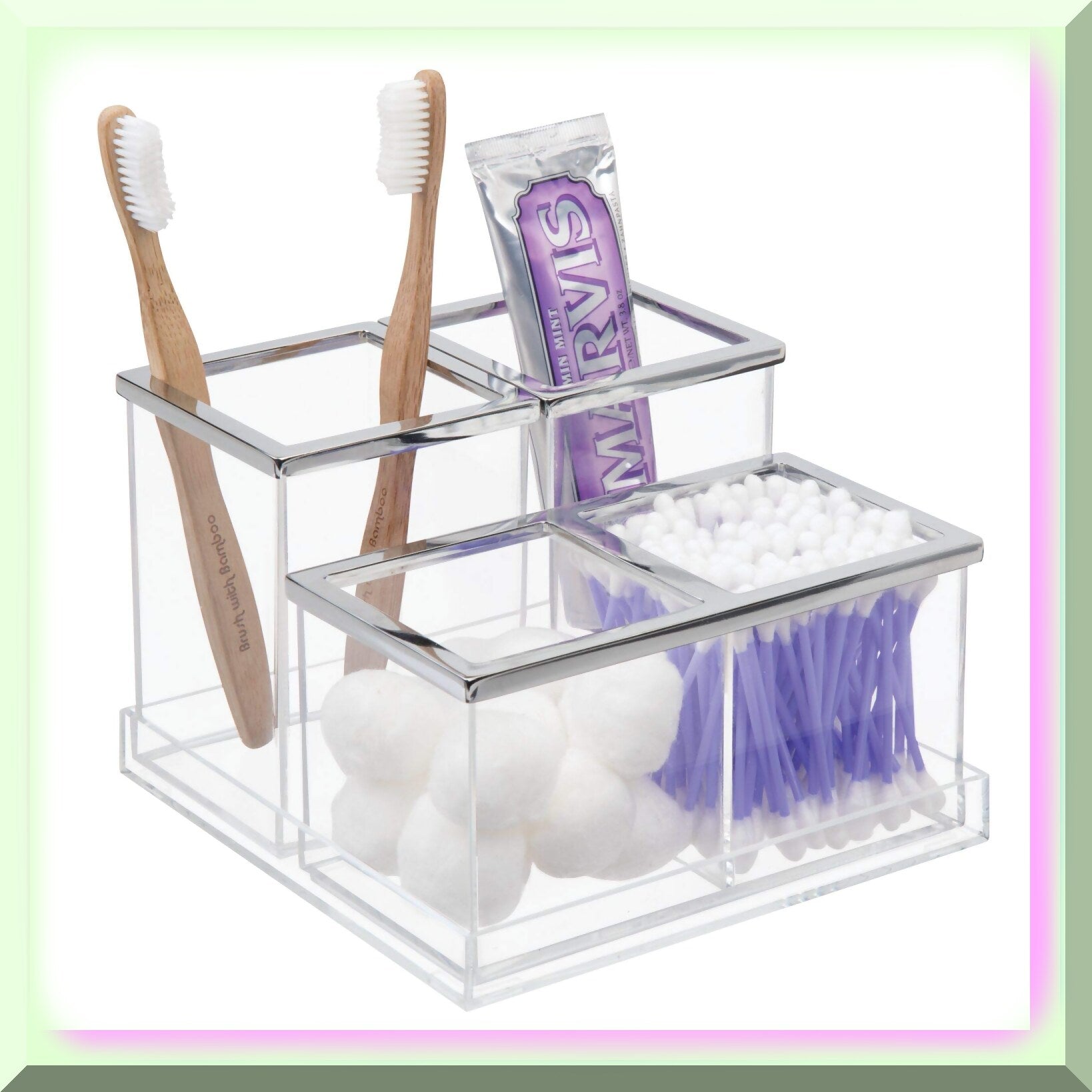Add style and function to your space with this customizable 4-piece organizer. Featuring four removable compartments, it offers flexible storage for items like toothbrushes, toothpaste, makeup brushes, applicators, and cosmetics. Its open top, tiered design, and raised sides keep contents upright, visible, and easily accessible. Designed for versatility, it can be used in the bathroom, office, closet, or bedroom to maximize organization. The durable BPA-free clear plastic construction ensures everyday durability and easy cleaning with mild soap and water. Measuring 6.5" x 6.5" x 4.53", this compact organizer fits well on bathroom counters, under sinks, or inside cabinets. Its modular design allows stacking with other organizers to expand storage options. Whether used for daily essentials or additional storage needs, this versatile organizer helps keep your space tidy and organized.