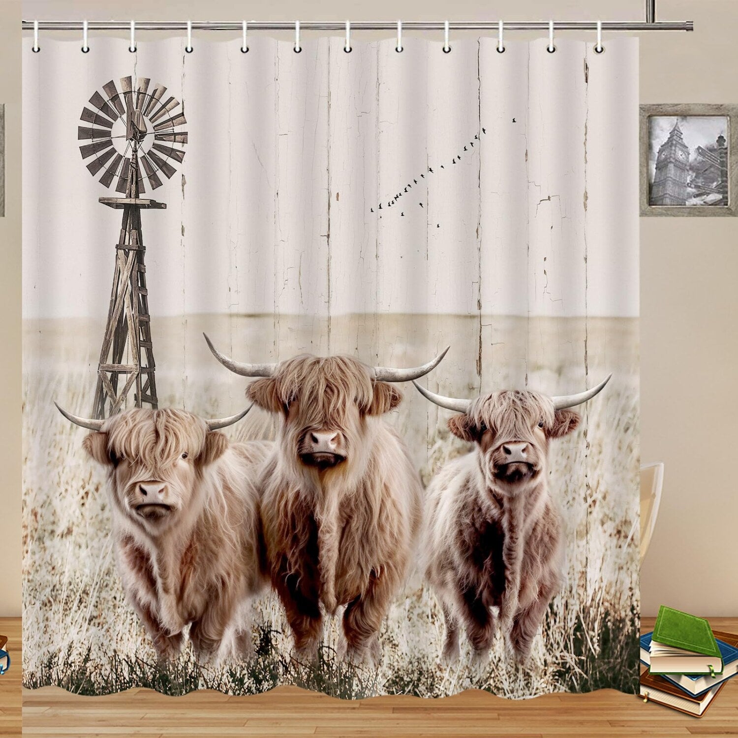 This shower curtain measures 70 x 70 inches and features a rustic farm scene with three cows, windmills, and vintage wooden planks, creating a country-themed bathroom decor. Made from polyester fabric, it is environmentally friendly, fade-resistant, and retains vibrant colors wash after wash. The soft and comfortable material provides a simple, understated look, perfect for enhancing your bathroom's aesthetic. Equipped with C-shaped hooks, it is easy to install on a steel tube, offering a hassle-free setup. The curtain effectively prevents water splashes outside the shower stall, maintaining a dry bathroom environment. Its printed design showcases a unique pattern with lovely colors, adding a fresh, clean look to your space. The curtain is machine washable—simply wash cold, do not bleach or tumble dry. Please note slight color variations may occur due to monitor differences, and manual measurement may result in a 1-2 cm error.