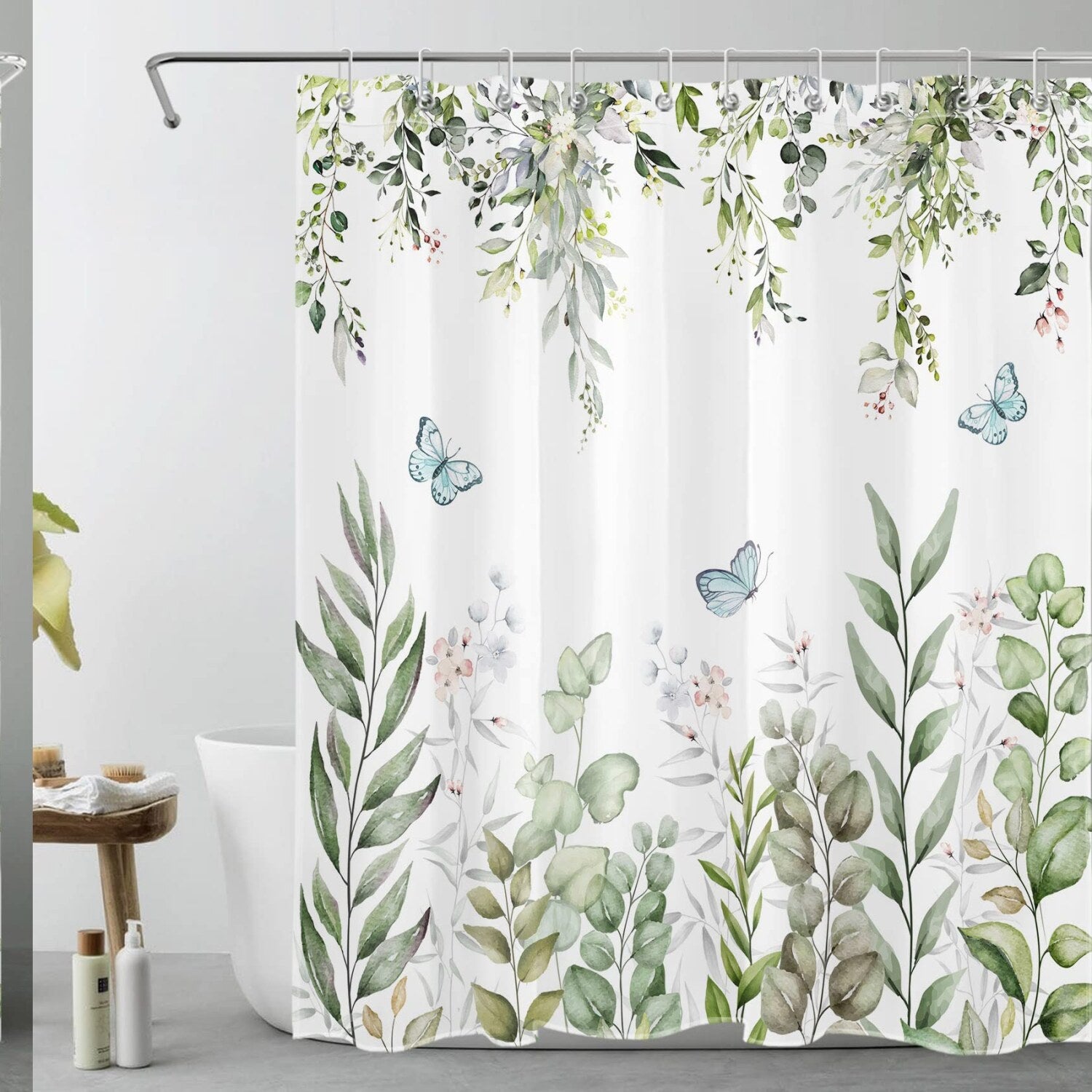 This shower curtain features a watercolor design of sage green eucalyptus leaves with butterflies, bringing a touch of spring and nature to your bathroom decor. Made from polyester fabric, it measures 60 x 72 inches and includes 10 white plastic hooks for easy installation. The curtain is designed with built-in eyelets that allow for simple on and off placement without coming loose. Its quick-drying material ensures it stays fresh even in bathrooms with limited ventilation. The high-definition digital printing pattern adds vibrant, exquisite detail, brightening up your space. It effectively prevents water spray during showers and offers privacy with its light-proof design. Suitable as a home accessory, it can also serve as a thoughtful gift for family and friends. Care instructions include low-temperature ironing; avoid tumble drying, bleaching, and dry cleaning. Slight color variations may occur due to screen differences, and measurements may have minor deviations.