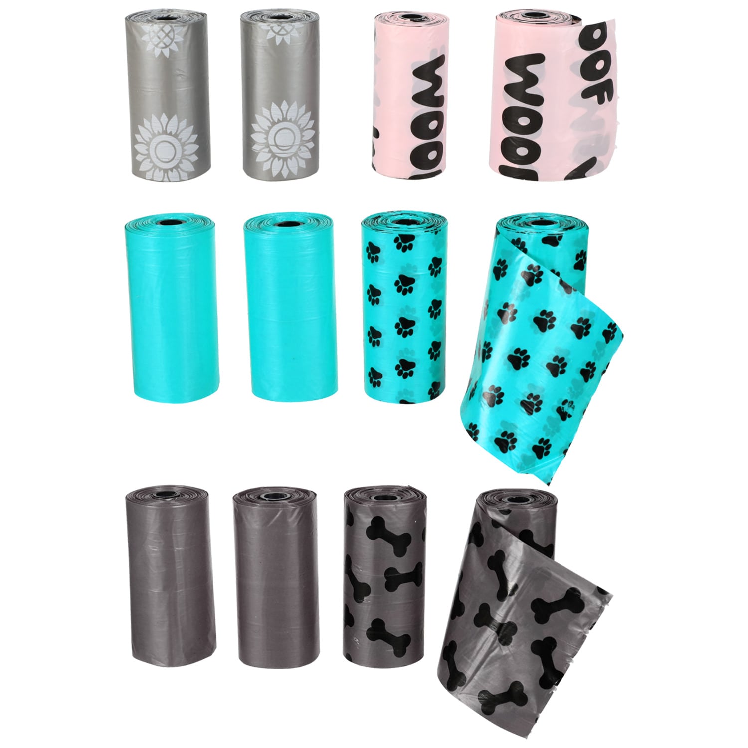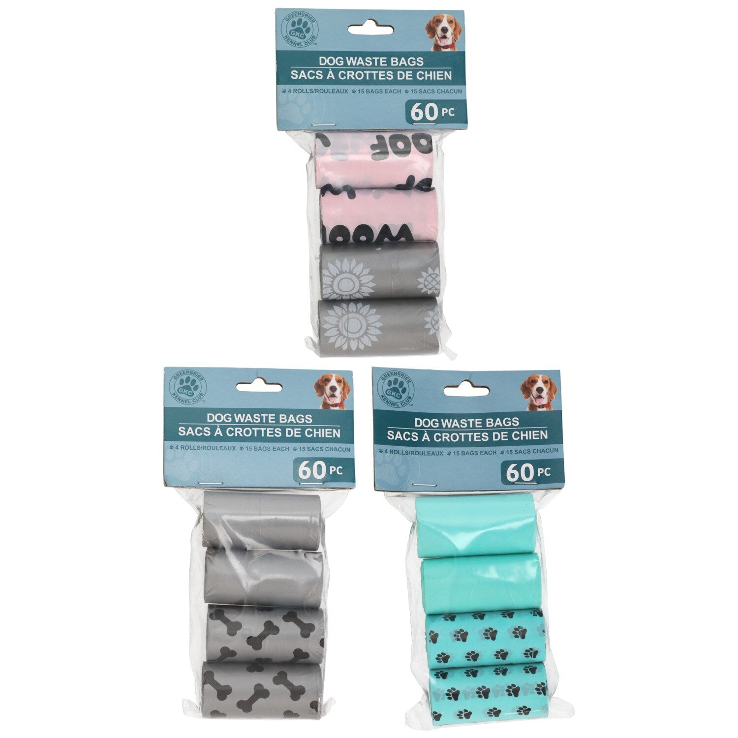 Comes with (Pack of 24). Do your part to keep your neighborhood beautiful! These dog waste bags make it quick and easy to clean up after your pups. Each package comes with four 15-ct. rolls of dog waste bags assorted among three pack designs including solid black bags, orange and black animal print bags, black and dark gray zebra print bags, solid pink bags, pink bags with black doggy bones, solid blue bags, and blue bags with black paw prints. Easy to carry in your pocket, purse, or jacket every time you head out to walk the dogs. Perfect for use at home, animal shelters, doggy training camps, and more.