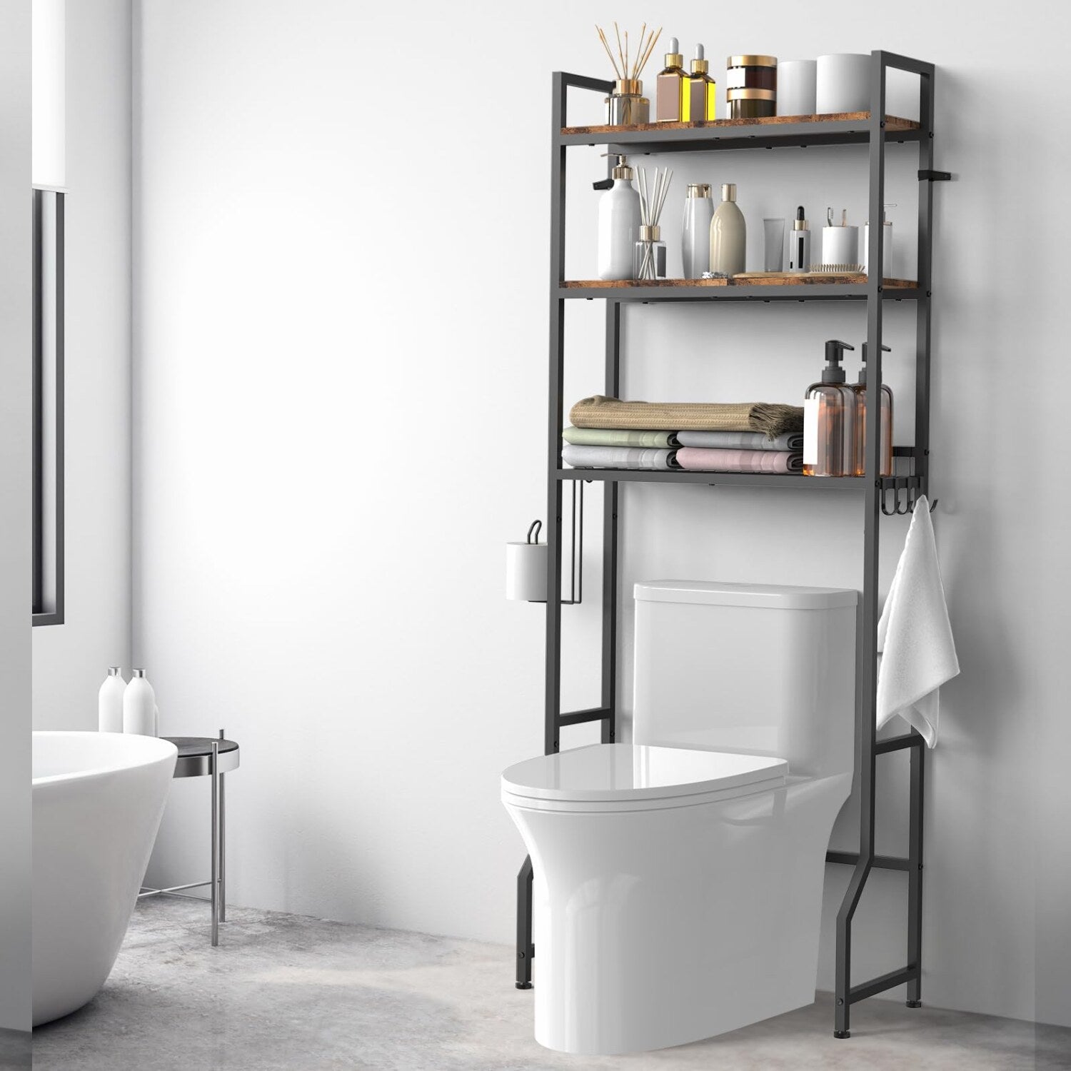 This 3-tier bathroom organizer features a rustic wooden board and a black metal frame, offering an elegant and noble appearance. The high-quality wooden surface is scratch-resistant and waterproof, making it easy to clean and maintain. Designed to maximize vertical space, it fits above the bathtub without taking up additional floor area. The multifunctional storage shelf includes four hooks and a tissue holder, providing extra storage options. An anti-tipping safety kit ensures stability and safety, making it suitable for households with children and pets. Adjustable footpads keep the unit stable and prevent ground scratches, even on uneven surfaces. The freestanding design allows for flexible placement in the bathroom, helping to organize towels, toiletries, and other essentials efficiently. This space-saving rack combines practicality with a stylish look, making it a functional addition to any bathroom.