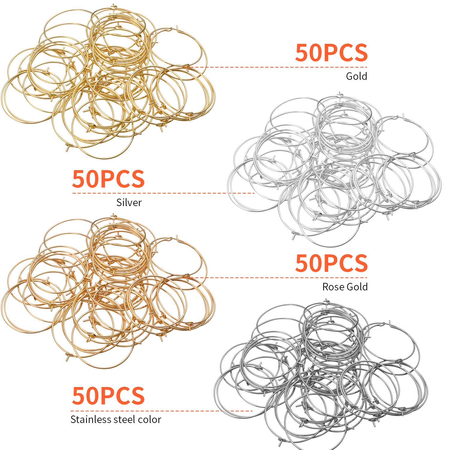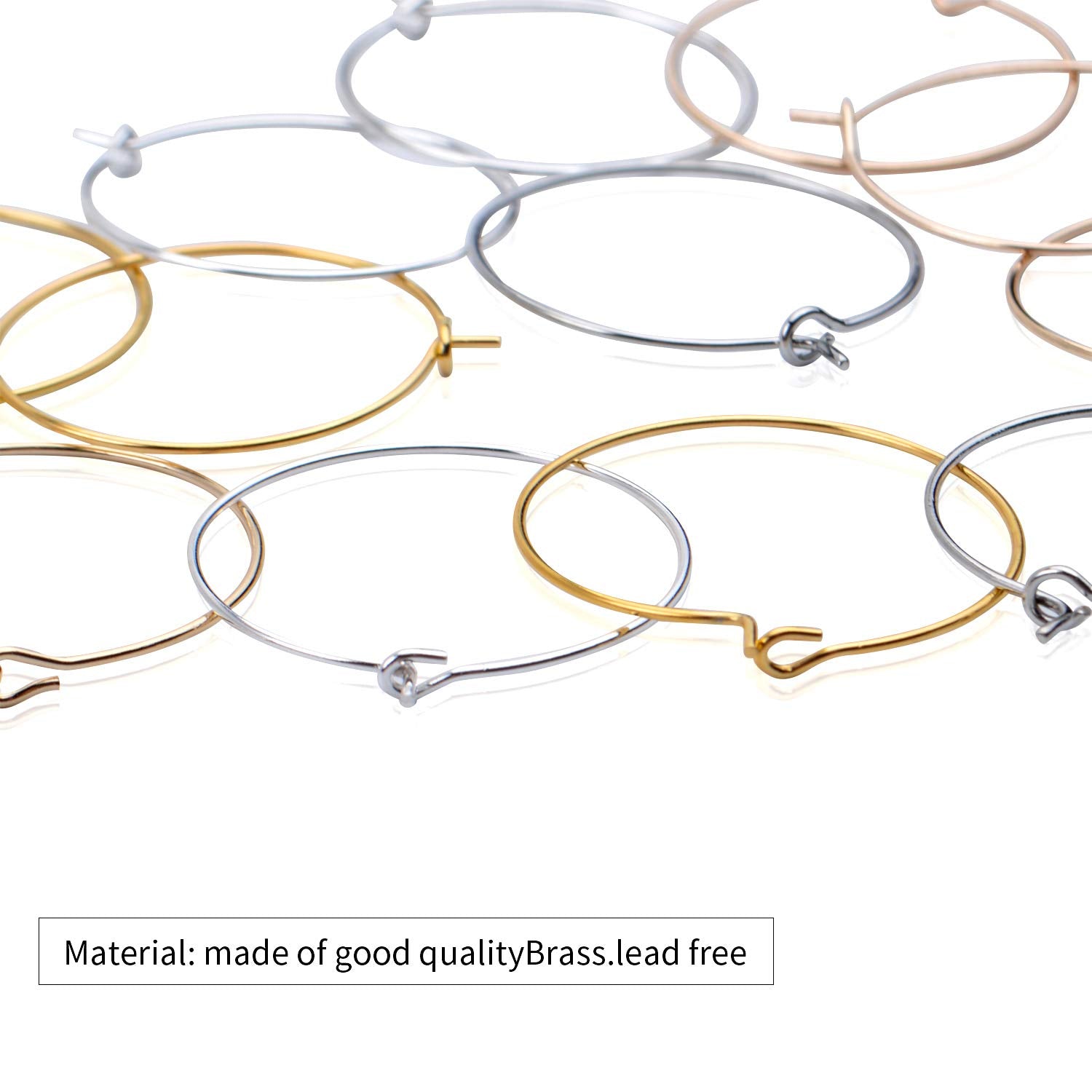 Set of 200 alloy wine glass charm rings in four colors: silver, gold, KC gold, and white K. Each ring measures 25mm, with some options at 28mm, suitable for jewelry making and craft projects. These versatile rings are lightweight, durable, and easy to open and close, making them ideal for creating personalized jewelry or decorating wine glasses at parties, weddings, festivals, and other celebrations. The pack includes 50 rings in each color, providing ample supply for various DIY projects. Use these rings to hang letter beads, attach decorative marks, or customize wine glasses for special occasions. Crafted from high-quality alloy, they maintain their shine and condition over time. Perfect for jewelry enthusiasts and crafters, these findings offer a practical solution for adding a personal touch to your accessories and event decorations. Suitable for a wide range of creative applications, these charm rings are a valuable addition to any craft collection.