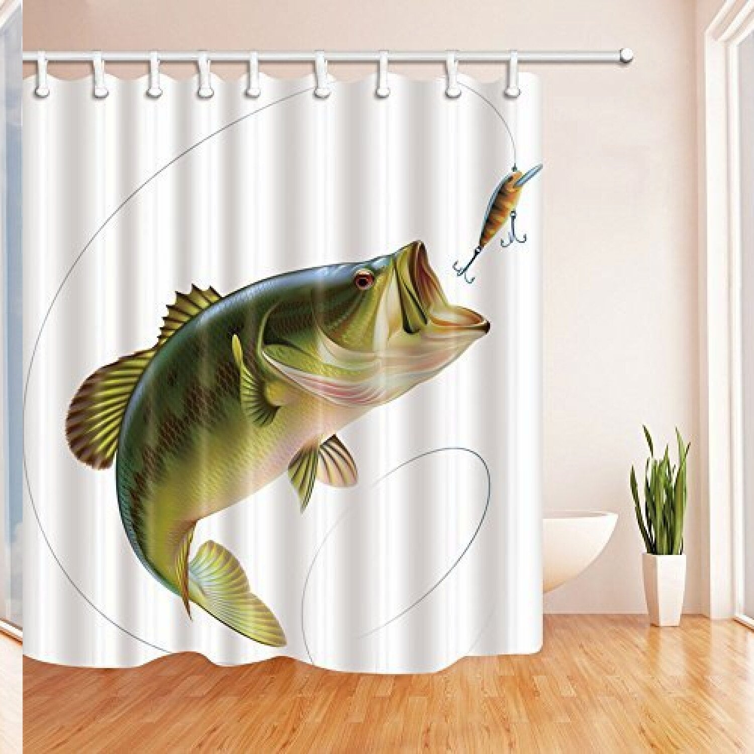 This 3D Digital Printing Fishing Shower Curtain measures 69 inches wide by 70 inches long and features a vibrant design of bait with fishing line eating litter fish. Made from quick-drying, durable polyester fabric, it offers a bright, clean appearance that enhances your bathroom decor. The waterproof fabric is machine washable, ensuring easy maintenance. The curtain includes 12 sturdy plastic hooks for easy installation. Its high-resolution digital printing creates a vivid, stereo effect, making your bathroom colorful and visually appealing. The design complements various bathroom accessories such as rugs and mats, adding a decorative touch. The pattern is printed with new digital technology, ensuring colors remain vibrant over time. The product can be customized with different themes, colors, and designs to suit personal preferences. Please note that slight color variations may occur due to digital printing. This shower curtain is a perfect addition to modern bathrooms and makes a thoughtful gift for friends and family.