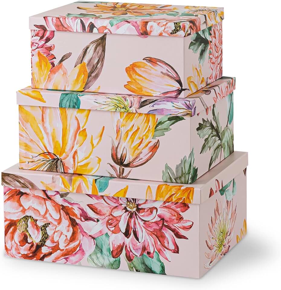 Set of three decorative cardboard storage boxes with lids designed for home organization and decor. These large keepsake boxes are ideal for storing memories, gifts, and personal items. The nesting floral design adds a touch of elegance to any space. Perfect for organizing photos, keepsakes, or small household items, these boxes combine functionality with aesthetic appeal. Their sturdy construction ensures durability, while the lids keep contents protected and dust-free. Suitable for use in bedrooms, living rooms, or offices, they help maintain a tidy environment while enhancing interior decor. The versatile design makes them suitable for various storage needs, from organizing personal mementos to presenting gifts. These boxes are a practical and attractive solution for keeping your belongings neatly stored and easily accessible. Their charming floral pattern adds a decorative element to any room, making them both functional and stylish.