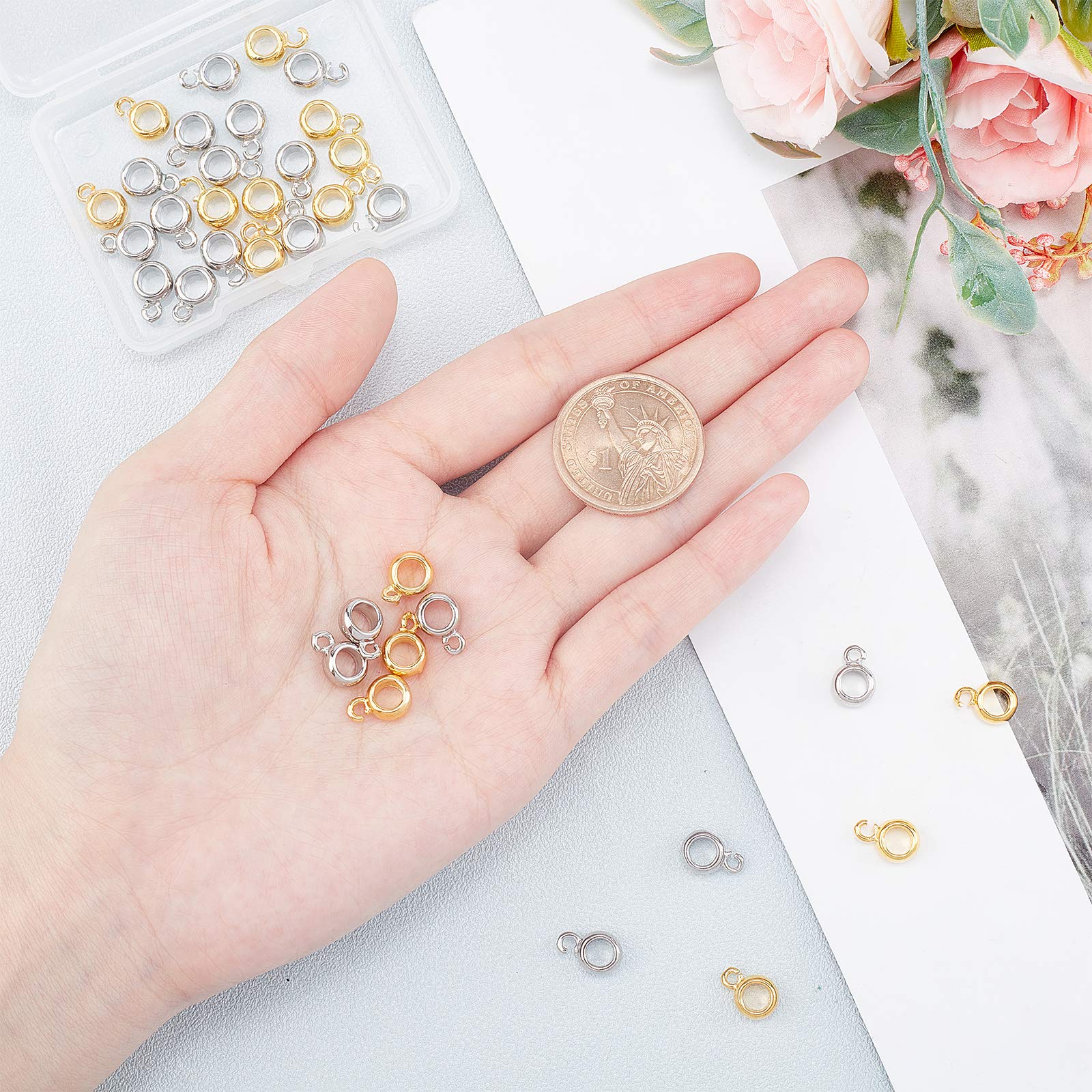 This set includes 40 multi-color bead bail links made from durable stainless steel material. Each piece measures approximately 8mm wide, 11.5mm long, with a 4mm thickness and a 2mm hole, featuring a 5mm inner diameter. The links are designed to fit large-hole beads and charms, making them ideal for jewelry projects. They are resistant to tarnish, rust, and corrosion, ensuring long-lasting use. These versatile connectors can be used with various cords such as cotton, leather, suede, elastic strings, or jewelry chains, suitable for creating bracelets, necklaces, and earrings. The unobtrusive natural color adds a subtle shine to your designs without overpowering other beads. Perfect for DIY jewelry enthusiasts, these multi-purpose links enhance the texture and style of your handmade accessories. Please note slight size variations may occur due to manual measurement, and color differences may be visible due to monitor settings. Keep small items away from children to prevent swallowing.