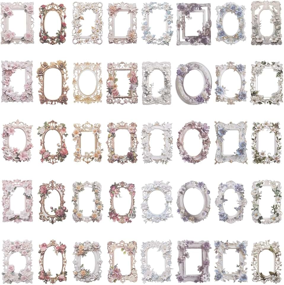 This set includes 80 vintage-style flower craft paper frames. Each frame features floral designs suitable for decorating scrapbook pages, photo borders, and art projects. The collection offers eight different styles, providing variety for creative projects. These decorative papers are ideal for enhancing albums, collages, and handmade cards. The designs are versatile and can be used for various craft and scrapbooking needs.