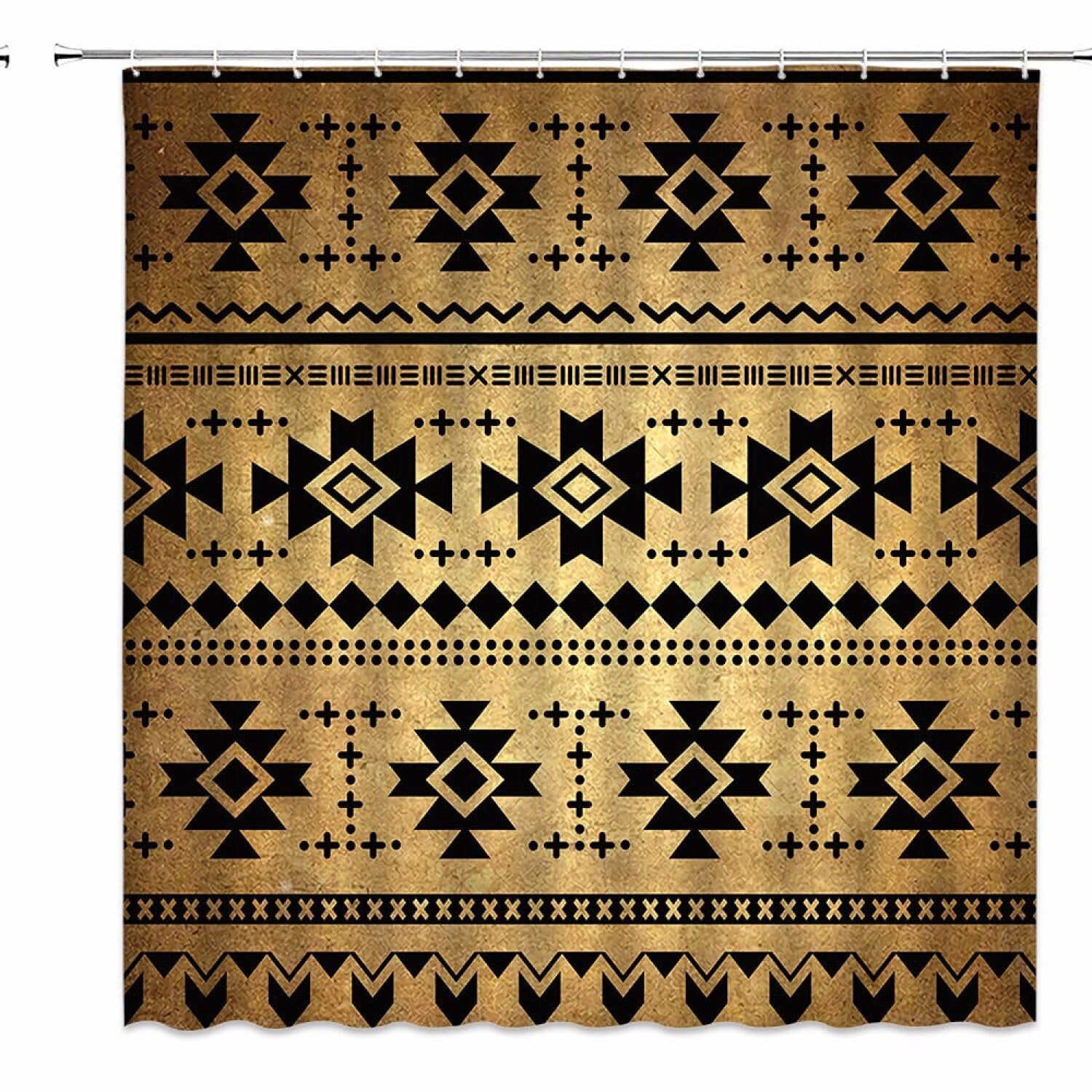 This boho geometric shower curtain features a brown and black aztec-inspired design with modern farmhouse and tribal elements. The abstract, retro, and mid-century fabric pattern adds a stylish touch to any bathroom decor. Measuring 70x70 inches, it provides ample coverage for your shower area. The curtain comes with free, strong plastic "C" hooks for easy installation. Please note that color variations may occur due to differences in monitor displays. Manual measurement may result in slight size differences, which are normal. This shower curtain combines a unique geometric pattern with functional design, making it a versatile addition to various bathroom styles. Its bold, earthy tones and distinctive pattern create a warm, inviting atmosphere while offering practical privacy and water resistance. Perfect for those seeking a blend of modern and vintage aesthetics in their bathroom decor.