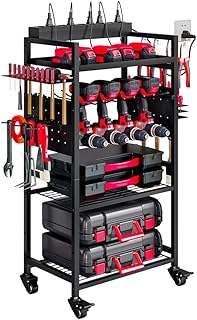 This large power tool organizer cart features a built-in charging station and a sturdy, floor-standing design with wheels for easy mobility. It provides ample storage space for drills, batteries, and other tools, helping to keep your workspace organized and efficient. The heavy-duty utility rack shelf is designed to support a variety of tools and equipment, making it suitable for garages, workshops, or job sites. The cart's durable construction ensures stability and long-lasting use, while the rolling wheels allow for convenient movement around the workspace. Its spacious compartments and secure storage options help prevent tool clutter and facilitate quick access. Ideal for professionals and DIY enthusiasts, this versatile storage solution enhances productivity and maintains an organized environment. Whether for a home garage or a professional workshop, it offers practical storage and charging capabilities to meet various tool management needs.