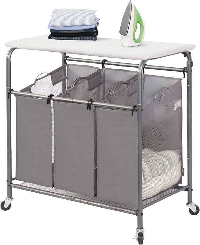 The STORAGE MANIAC 3-Section Laundry Sorter features a foldable ironing board and a heavy-duty rolling laundry cart with removable bags. Designed for convenience, it offers three spacious compartments for sorting laundry efficiently. The sturdy frame ensures durability, while the wheels provide easy mobility around the home. The removable bags make laundry transfer simple and organized. The dark grey finish adds a sleek, modern look to any space. The foldable ironing board provides a convenient surface for pressing clothes, saving space when not in use. This versatile laundry station combines functionality with practicality, making laundry tasks more manageable. Its durable construction and thoughtful design help streamline laundry routines, reducing clutter and effort. Ideal for busy households, it offers a practical solution for sorting, transporting, and ironing laundry with ease.