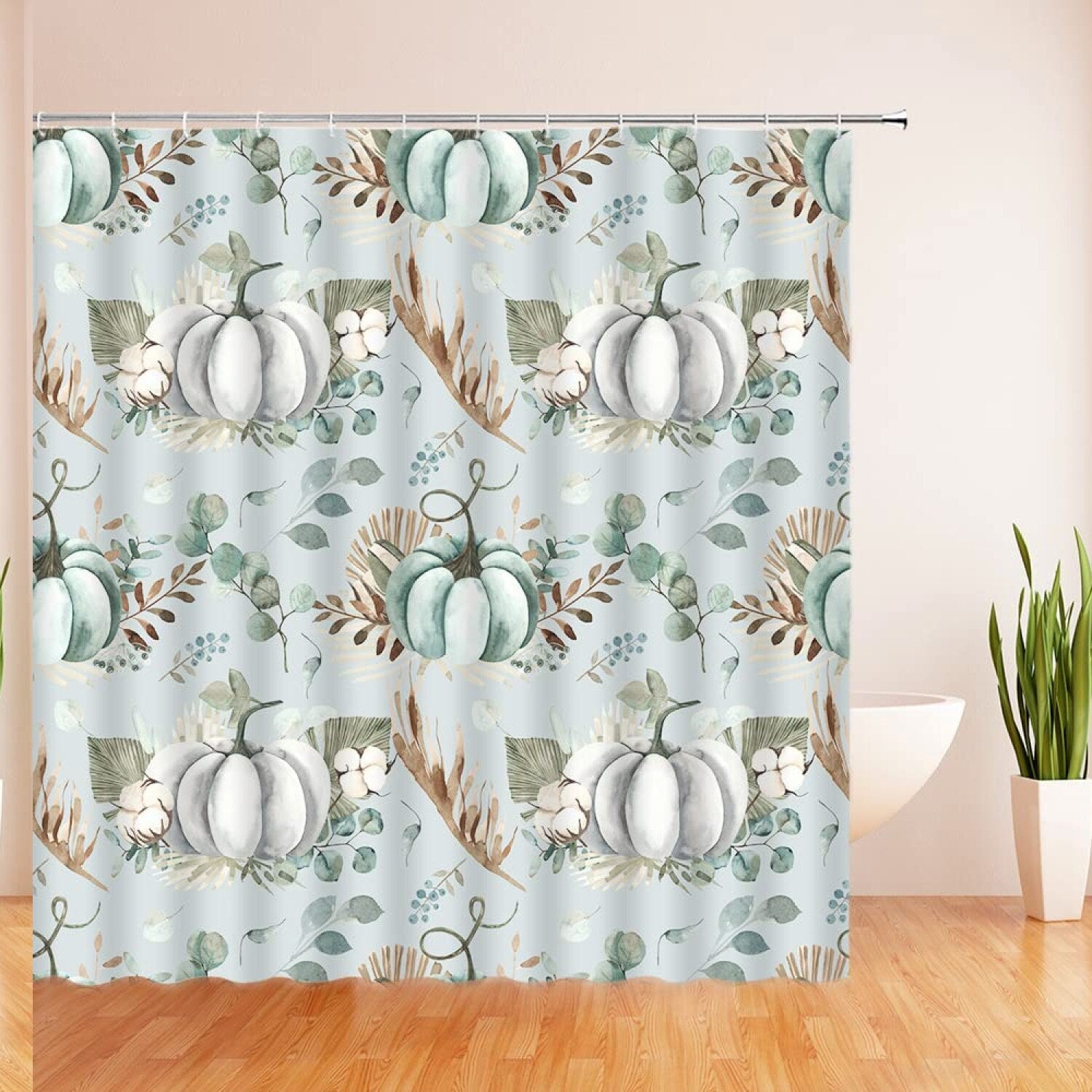This fall-themed shower curtain features a vintage watercolor design of pumpkins, green leaves, and rustic farm elements, perfect for autumn decor. Made from soft, durable 100% polyester fabric, it measures 70 inches wide by 70 inches high (180x180cm). The vibrant 3D digital pattern showcases exquisite images with no fading, thanks to a high-quality printing process. The pattern's colorful and detailed design adds a sleek, stylish touch to your bathroom. Easy to care for, the curtain is machine washable and can be hung dry, making maintenance simple. It comes with 12 hooks for easy installation, ensuring a quick setup. Please allow a 1-2 cm deviation due to manual measurement and slight color differences caused by screen resolution and lighting. This versatile fabric bath curtain is ideal for enhancing your farmhouse or autumn-themed bathroom decor, bringing a cozy, festive atmosphere to your space.