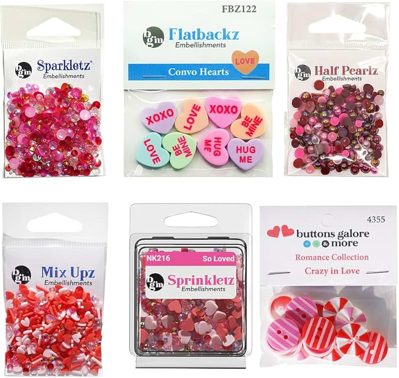 This collection includes six packs of craft embellishments perfect for Valentine's Day projects. It features a variety of buttons, pearls, rhinestones, heart-shaped accents, and sprinkles. These supplies are ideal for adding decorative touches to cards, scrapbooks, and other creative crafts. The assortment provides a range of textures and styles to enhance your designs. Suitable for various craft projects, these embellishments help create festive and personalized decorations. The set offers a convenient way to gather different embellishments in one package, making it easy to add charming details to your Valentine's Day crafts.