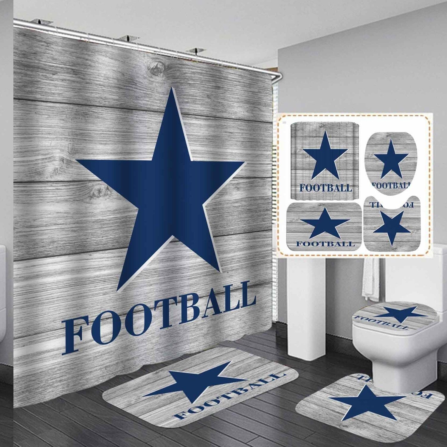 This 4-piece set includes a navy blue Texas star fabric shower curtain, a floor mat, a U-shaped mat, and a Tet lid cover mat, designed to enhance bathroom decor with a rustic and sporty theme. The shower curtain measures 180 x 180 cm (72 x 72 inches) and features high-definition printing with distinctive designs, providing waterproof protection. The non-slip bath rugs are soft, durable, and designed for safety and comfort, with the floor mat measuring 45 x 75 cm (18 x 30 inches), the U-shaped mat 37 x 45 cm (14.5 x 18 inches), and the Tet lid cover 35 x 37 cm (13.8 x 14.5 inches). Crafted with skilled craftsmanship and advanced printing technology, these items are easy to maintain—shower curtain is machine washable, while mats are recommended for hand washing. Please allow slight measurement deviations and color variations due to manual measurement and display differences.