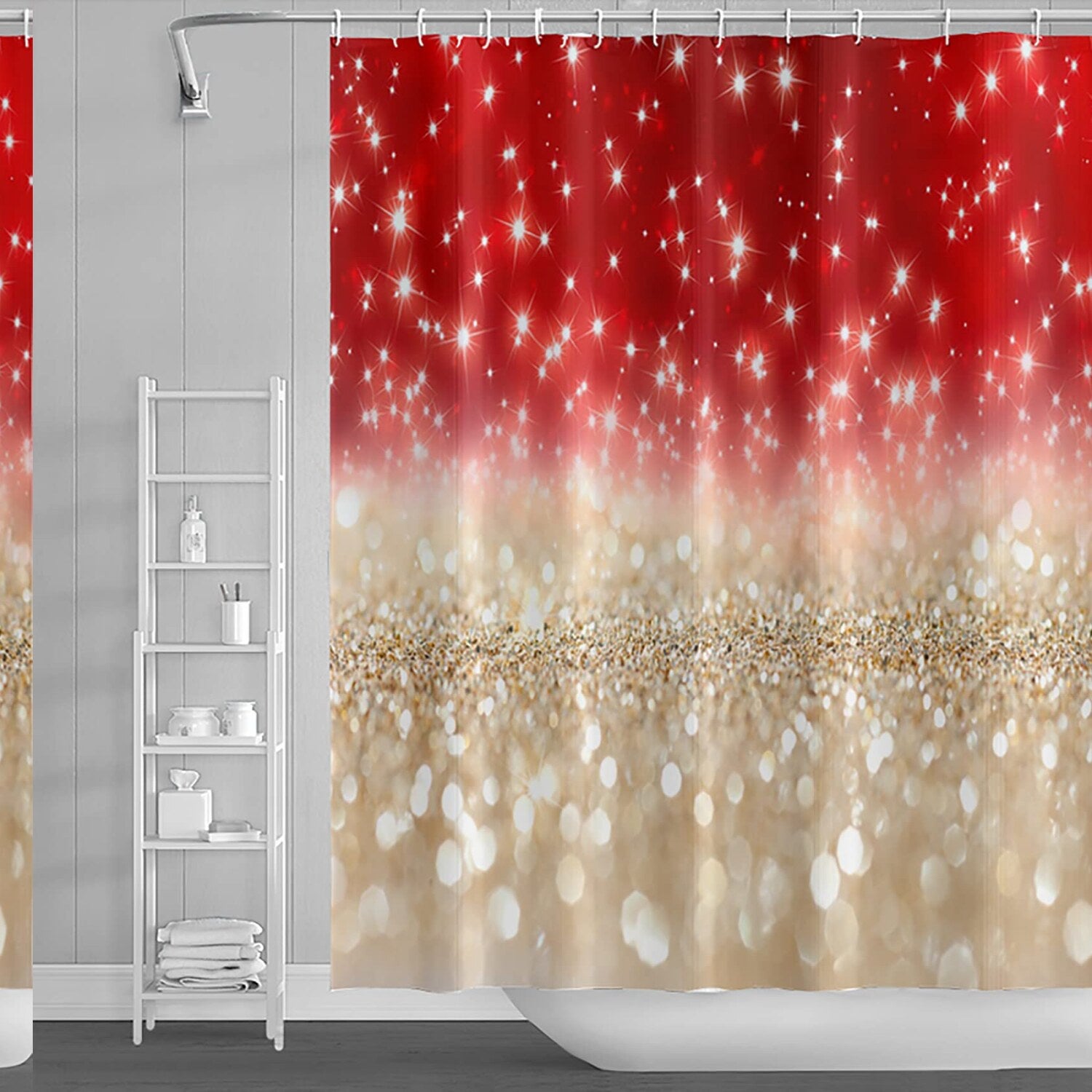 This shower curtain measures 69 inches wide by 70 inches long and features a vibrant red and gold color theme with shiny glitter spots and sequins, creating a dreamy, girly, womanly style. Made from 100% polyester fabric, it offers a soft, comfortable feel while ensuring waterproof durability. The high-definition 3D printing technology provides bright, clear, and fade-resistant colors, adding depth and visual interest to your bathroom decor. Easy to install, simply fix the hooks on the pole and hang the curtain. The quick-drying, machine-washable fabric makes maintenance simple. Its stylish design enhances any bathroom, transforming it from dull to fabulous. Customization options are available for sizes and patterns, allowing you to personalize your space with your favorite themes or images. Please note that actual dimensions may vary slightly. Designed to beautify your bathroom and provide a pleasant shower experience, this curtain combines functionality with eye-catching style.