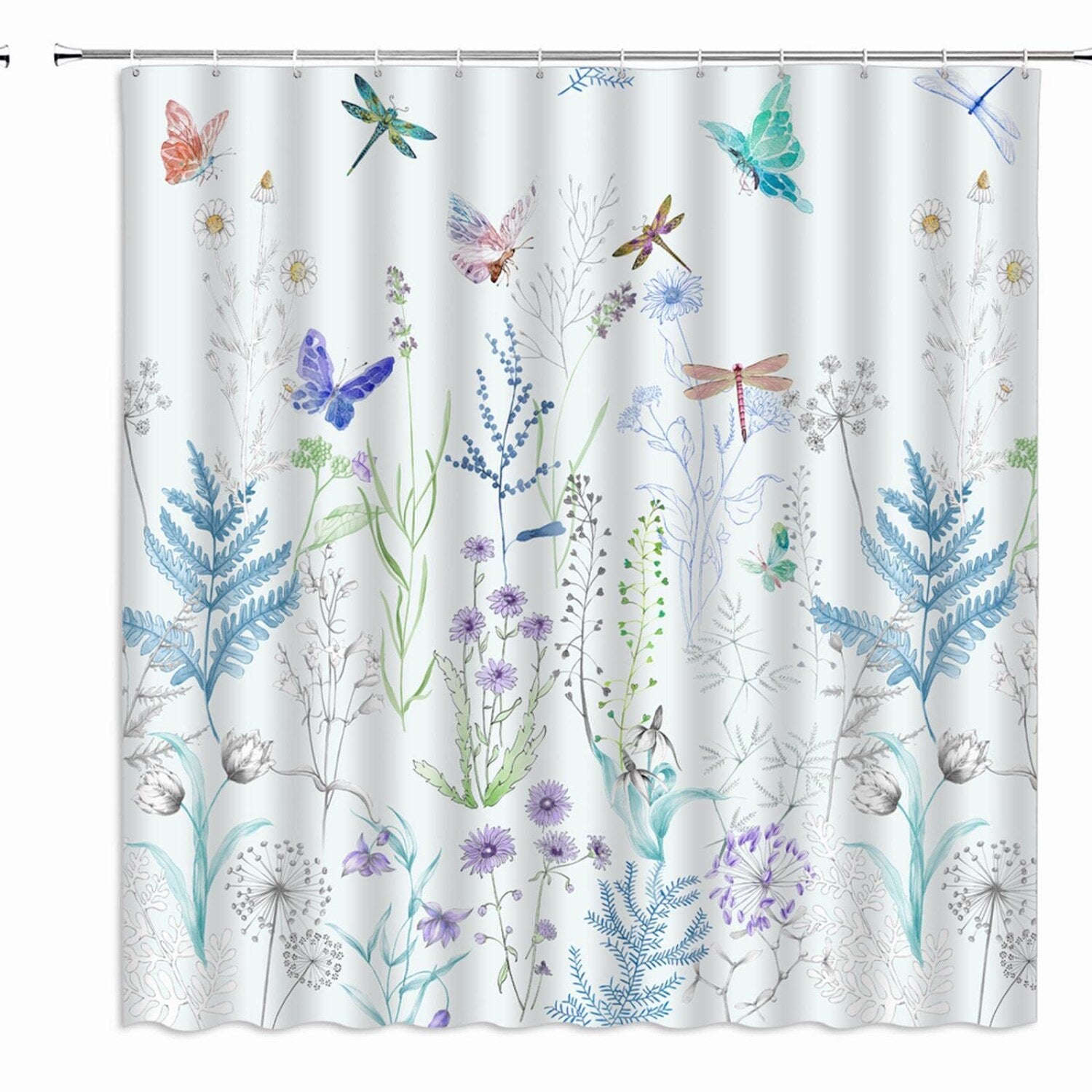 This colorful fabric shower curtain measures 70 inches by 70 inches (180 cm x 180 cm), featuring a vibrant watercolor floral design with dragonflies, butterflies, wildflowers, and plants in purple and blue hues. Made from 100% polyester, it is easy to set up and clean, with included free hooks for convenience. The curtain is suitable for most bathrooms and standard-sized bathtubs. It is machine washable—please avoid high temperatures and bleach, and hang to dry. Due to manual measurement, a slight size variation of 1-2 cm may occur. The printed design may display minor color differences depending on screen settings and printing variations. This decorative shower curtain makes a thoughtful gift for friends and family, perfect for sharing with loved ones such as girlfriends, boyfriends, spouses, children, or grandchildren. Please note the product is printed individually, which may result in slight color and pattern differences.