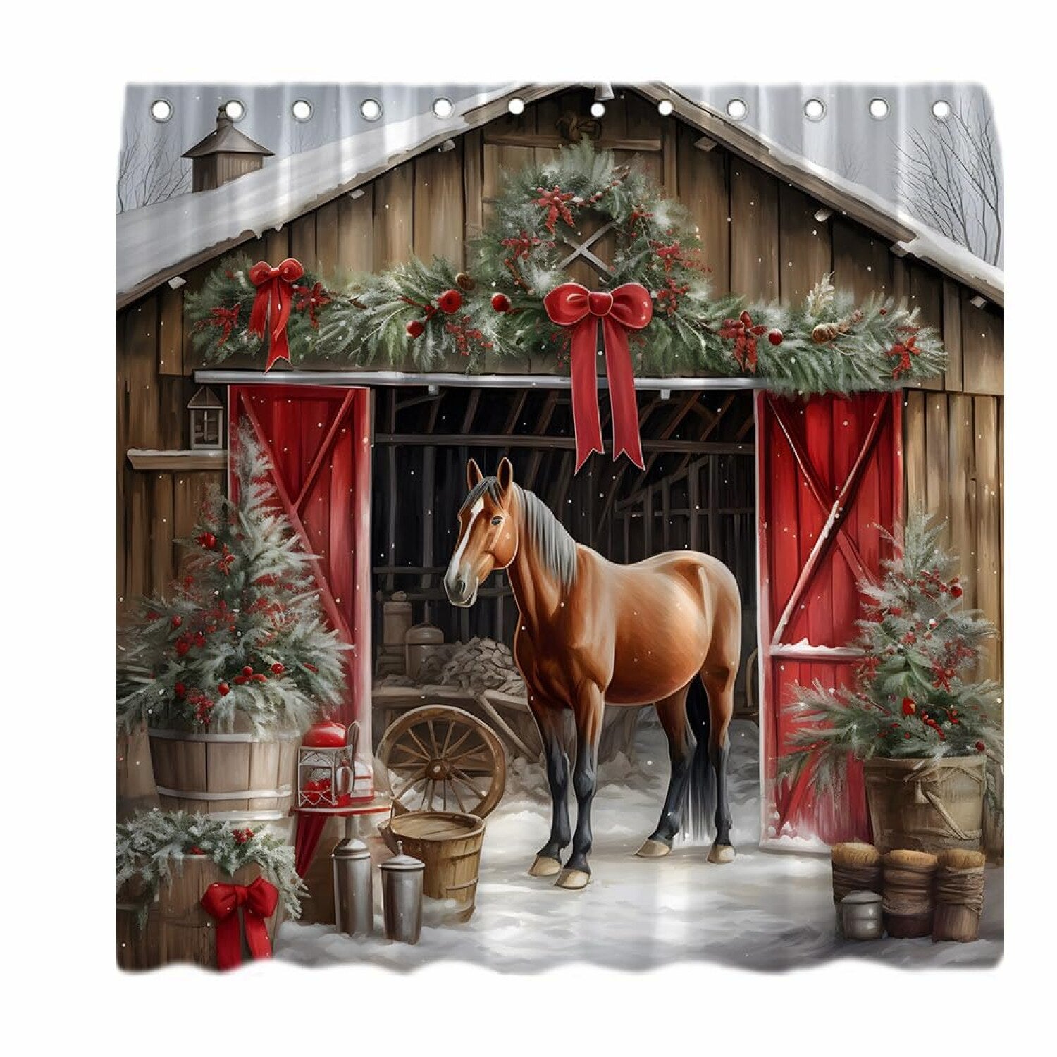 This rustic vintage-style shower curtain features a brown animal and wooden barnhouse design, perfect for most standard-sized bathrooms. Made from quick-drying 100% polyester fabric, it measures 70 x 70 inches and includes 12 free hooks for easy installation on a steel tube. The soft and comfortable material helps prevent water splashes outside the shower stall, providing a simple and understated look. Its versatile design complements various bathroom decors, especially those inspired by western, nature, snow, winter, or holiday themes. The curtain is machine washable in cold water and should be dried slowly or air-dried; bleach is not recommended. Available in multiple dimensions, it offers flexibility to fit different spaces. Please note slight color variations may occur due to monitor differences, and manual measurement may result in a 1-2 cm error. A 30-day return and replacement service is offered for customer satisfaction.