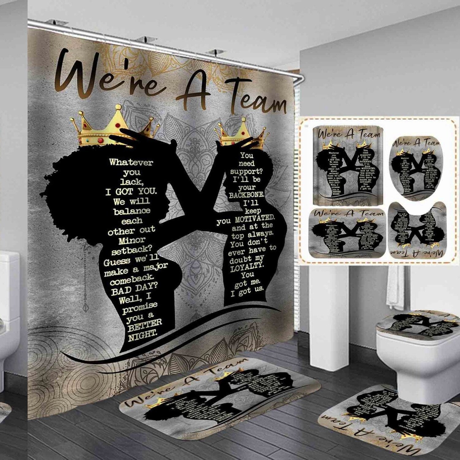 This set includes one shower curtain measuring 180x180 cm, three soft flannel rugs, and twelve hooks, providing a complete bathroom decor solution. The shower curtain is made from upgraded, waterproof polyester material that is hygienic, durable, and easy to clean. The rugs are crafted from friendly, soft flannel, offering comfort and a non-slip surface for safety. The non-slip rugs are durable, machine washable, and dry quickly, making maintenance simple. The design features romantic and inspirational quotes, with elegant grey flower patterns and a touch of luxury with gold accents, creating a stylish and motivational bathroom atmosphere. The set is suitable for various bathroom sizes and is designed for easy care—machine wash below 30°C, avoid tumble drying, bleaching, or dry cleaning. Please note slight color variations may occur due to display differences, and manual measurements may have a 1-2 cm deviation.