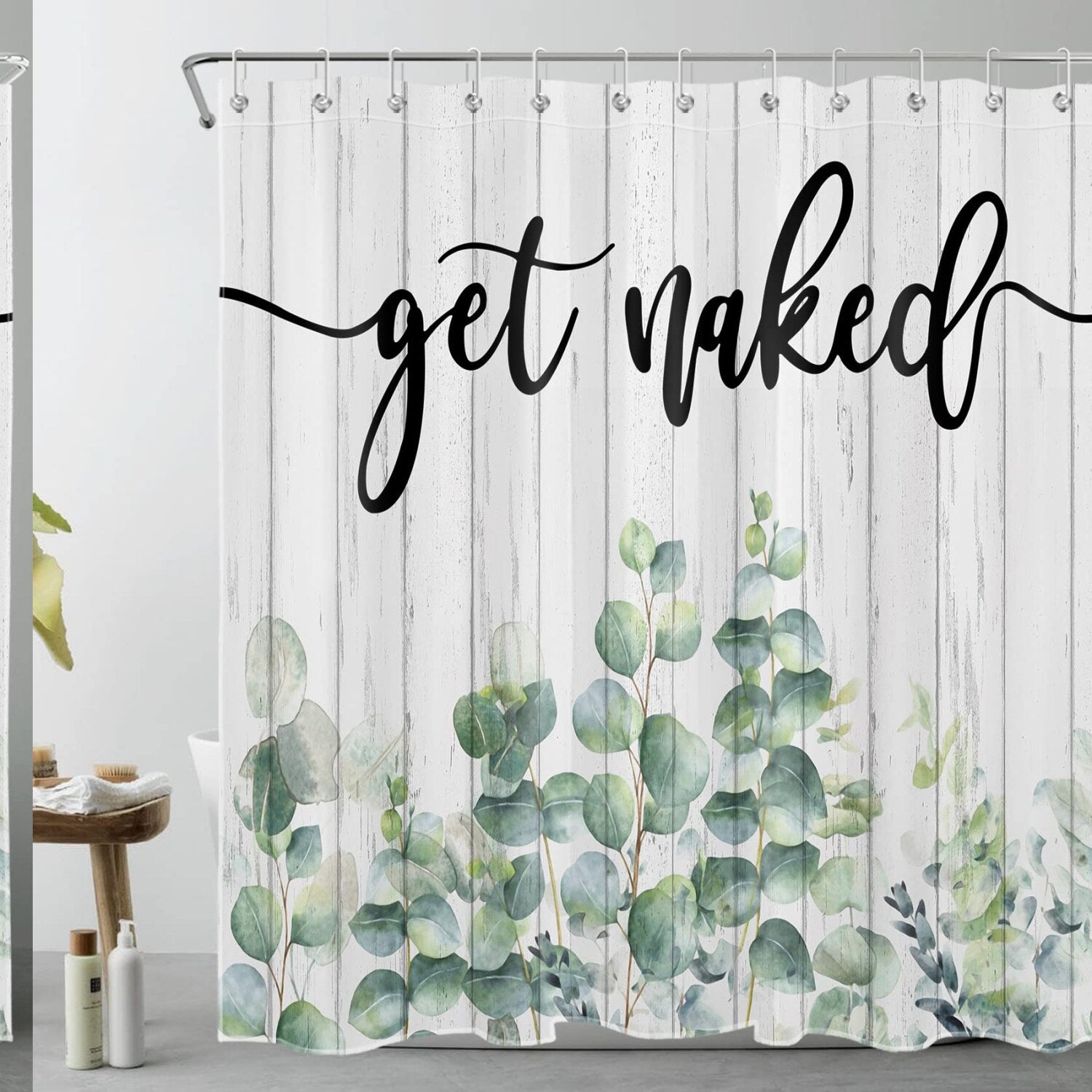This eucalyptus shower curtain features a soothing sage green leaf design combined with humorous words displayed on rustic wooden boards, adding a touch of whimsy to your bathroom decor. Made from high-quality polyester fabric, it offers a soft, smooth, and flowing texture that enhances comfort. The curtain measures 72x72 inches, providing ample coverage to protect your privacy while allowing water to stay within the bathroom. It is designed to dry quickly, thanks to its water-resistant surface, and is durable for long-term use. The set includes one shower curtain and twelve plastic hooks for easy installation. Care is simple: it can be hand or machine washed in cold water, should be hung to dry in shaded areas, and ironed at low temperatures if needed. This vibrant, digitally printed curtain maintains its color and clarity over time, making it a practical and stylish addition to any bathroom.