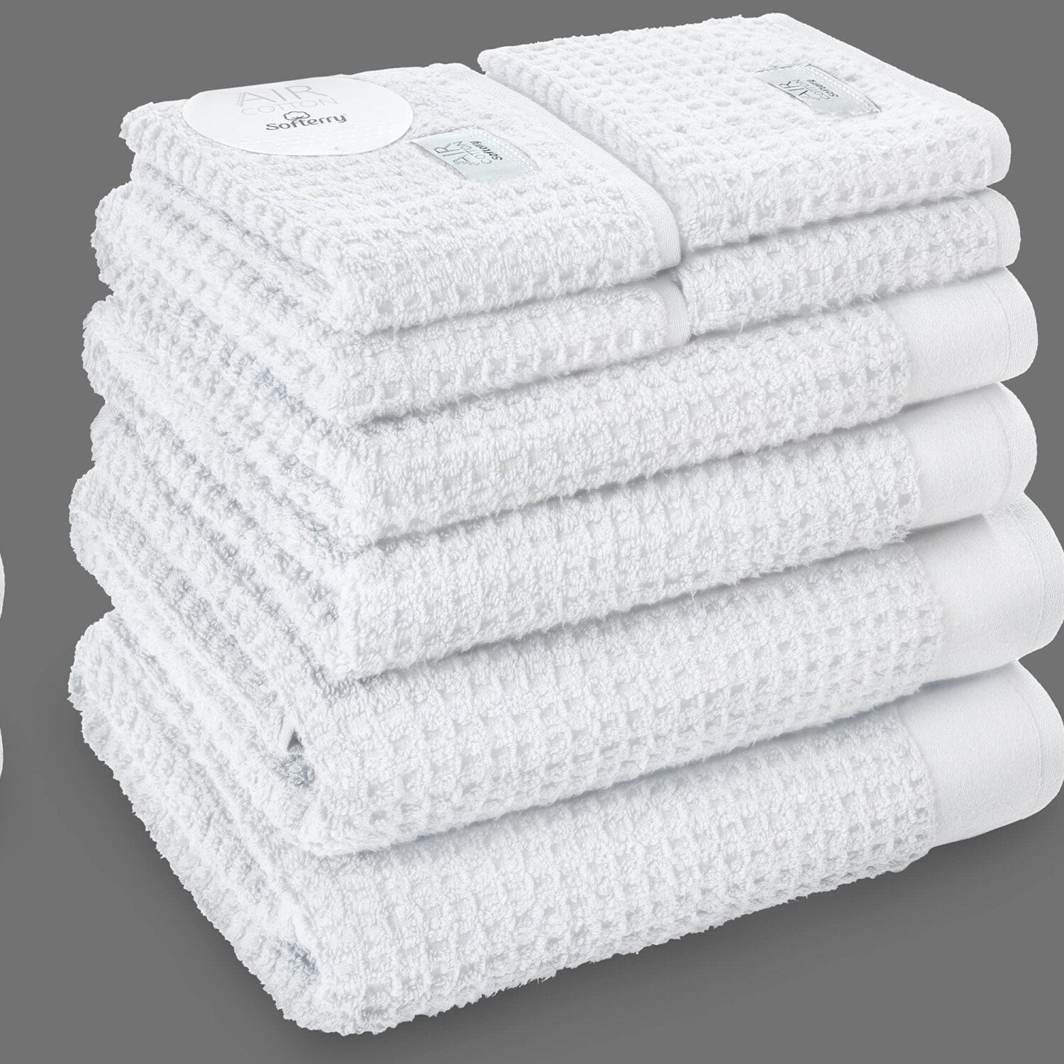 This Waffle Bath Towel Set features eight towels crafted from 100% soft cotton, offering a luxurious and modern design. The towels are designed with a waffle texture that enhances their appearance while providing a sophisticated look. Made with innovative Air Cotton zero twist technology, these towels deliver high absorption capacity, ensuring they quickly and effectively dry. The plush terry fabric provides a soft, delicate touch and added volume for a luxurious feel. Their fade-resistant and eco-friendly construction make them suitable for environmentally conscious homes. Perfect for everyday use, these towels combine elegance with practicality, offering a spa-quality experience in your own space. The set’s stylish design and superior absorbency make it an ideal addition to any contemporary bathroom, providing both comfort and durability.